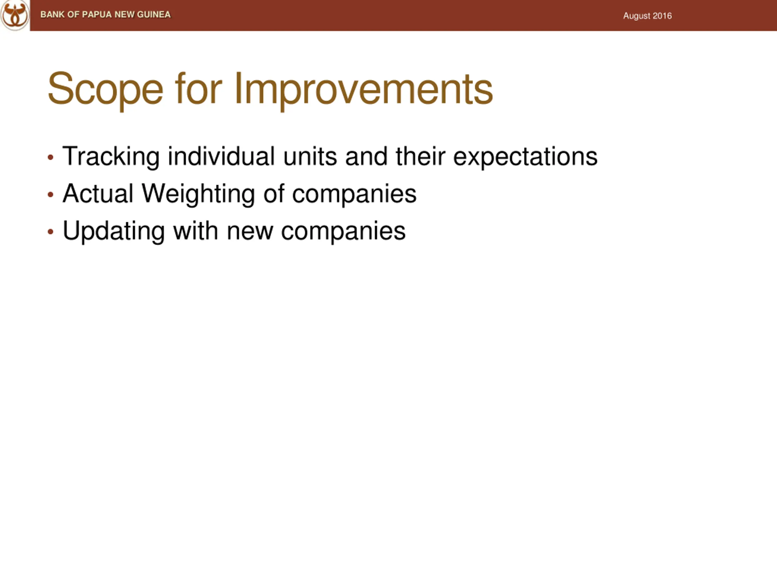 BANK OF PAPUA NEW GUINEA August 2016 Scope for Improvements Tracking individual units and their expectations Actual Weighting of companies Updating with new companies