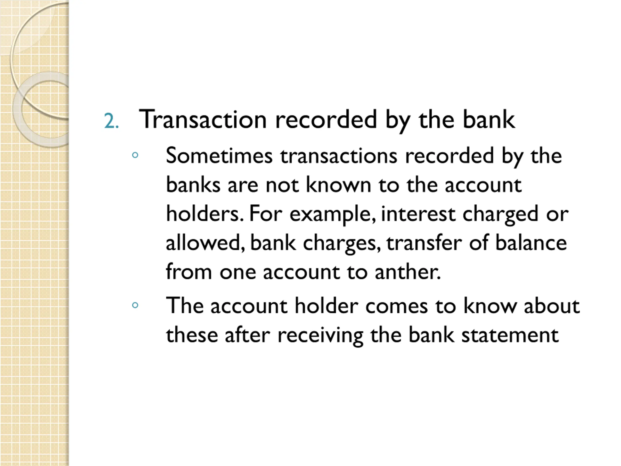 2. Transaction recorded by the bank Sometimes transactions recorded by the banks are not known to the account holders. For example, interest charged or allowed, bank charges, transfer of balance from one account to anther. The account holder comes to know about these after receiving the bank statement