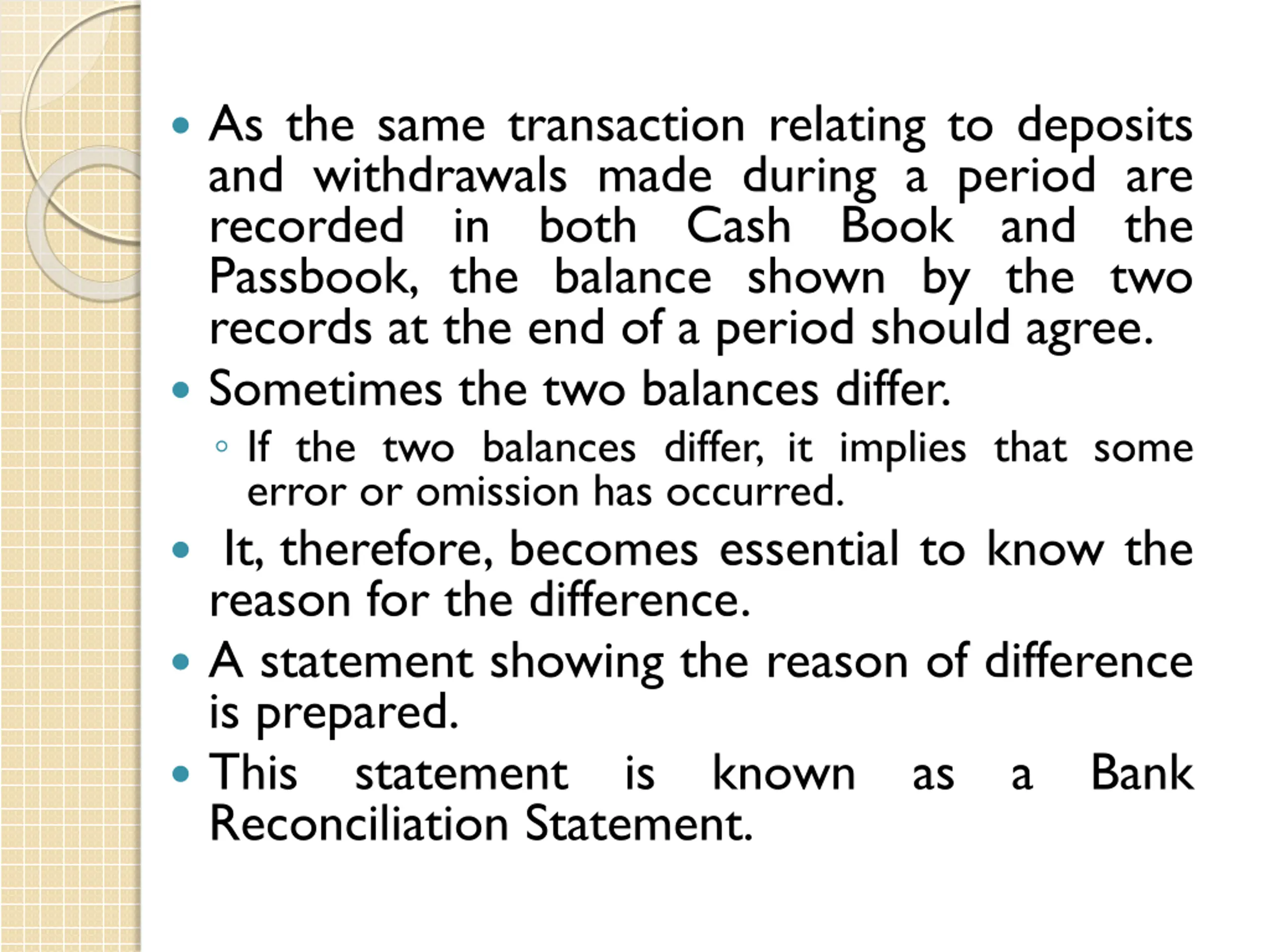 As the same transaction relating to deposits and withdrawals made during a period are recorded in both Cash Book and the Passbook, the balance shown by the two records at the end of a period should agree. Sometimes the two balances differ. If the two balances differ, it implies that some error or omission has occurred. It, therefore, becomes essential to know the reason for the difference. A statement showing the reason of difference is prepared. This statement is Reconciliation Statement. known as a Bank