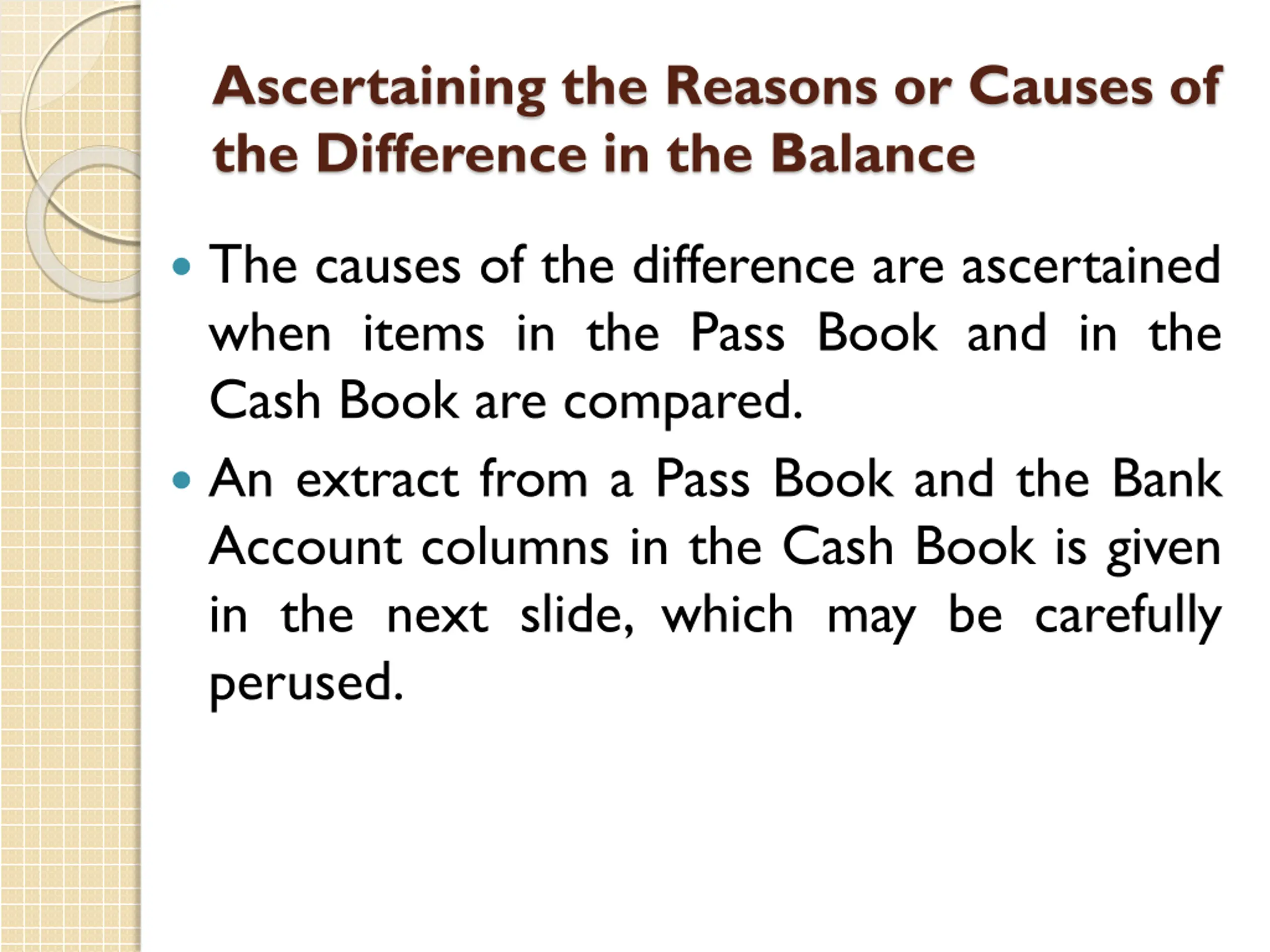 Ascertaining the Reasons or Causes of the Difference in the Balance The causes of the difference are ascertained when items in the Pass Book and in the Cash Book are compared. An extract from a Pass Book and the Bank Account columns in the Cash Book is given in the next slide, which may be carefully perused.