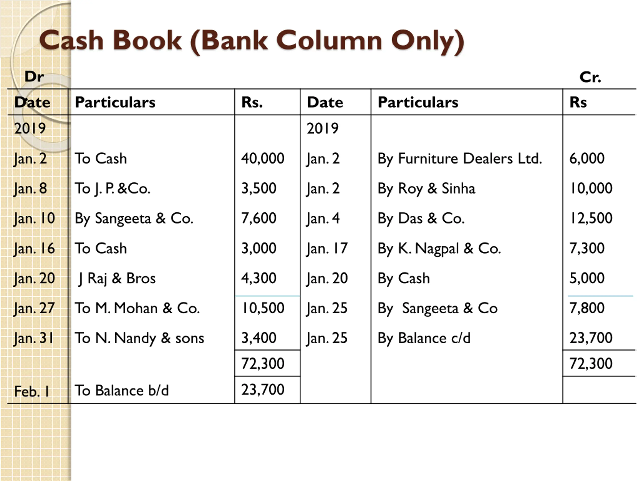 Cash Book (Bank Column Only) Dr . Cr. Date 2019 Particulars Rs. Date 2019 Particulars Rs Jan. 2 To Cash 40,000 Jan. 2 By Furniture Dealers Ltd. 6,000 Jan. 8 To J. P. &Co. 3,500 Jan. 2 By Roy & Sinha 10,000 Jan. 10 By Sangeeta & Co. 7,600 Jan. 4 By Das & Co. 12,500 Jan. 16 To Cash 3,000 Jan. 17 By K. Nagpal & Co. 7,300 Jan. 20 J Raj & Bros 4,300 Jan. 20 By Cash 5,000 Jan. 27 To M. Mohan & Co. 10,500 Jan. 25 By Sangeeta & Co 7,800 Jan. 31 To N. Nandy & sons 3,400 72,300 23,700 Jan. 25 By Balance c/d 23,700 72,300 To Balance b/d Feb. 1