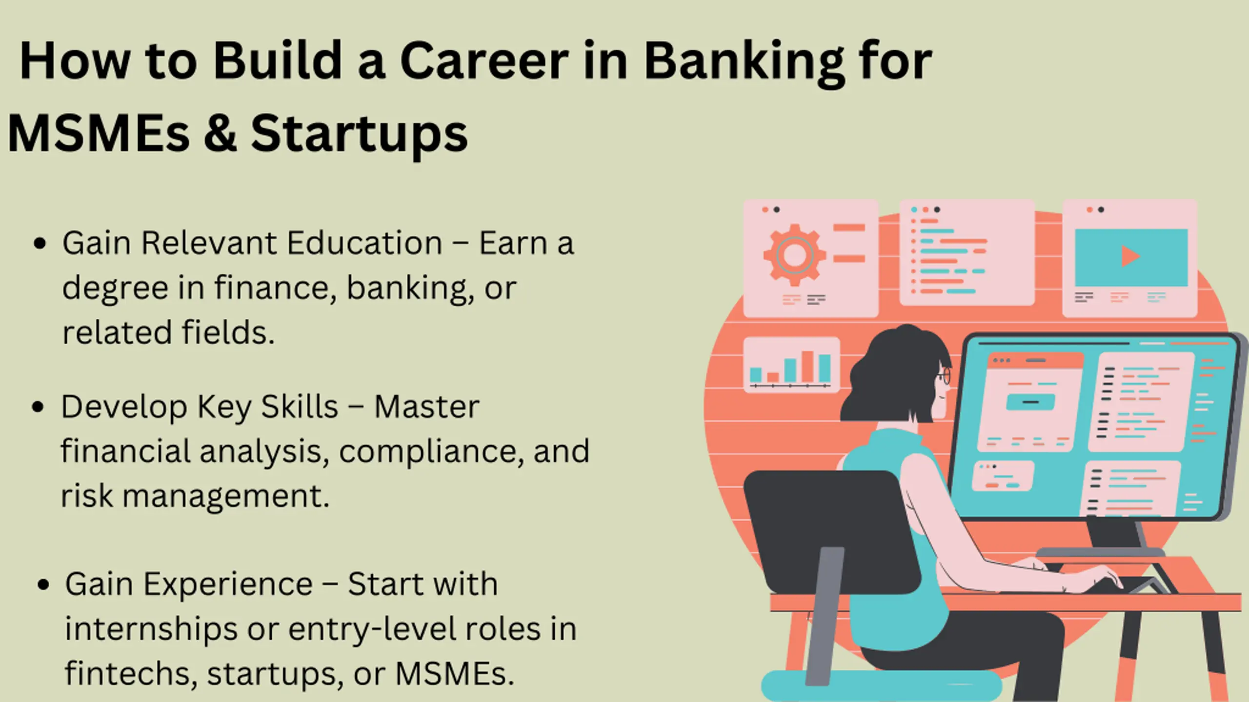 How to Build a Career in Banking for MSMEs & Startups Gain Relevant Education Earn a degree in finance, banking, or related fields. Develop Key Skills Master financial analysis, compliance, and risk management. Gain Experience Start with internships or entry-level roles in fintechs, startups, or MSMEs.