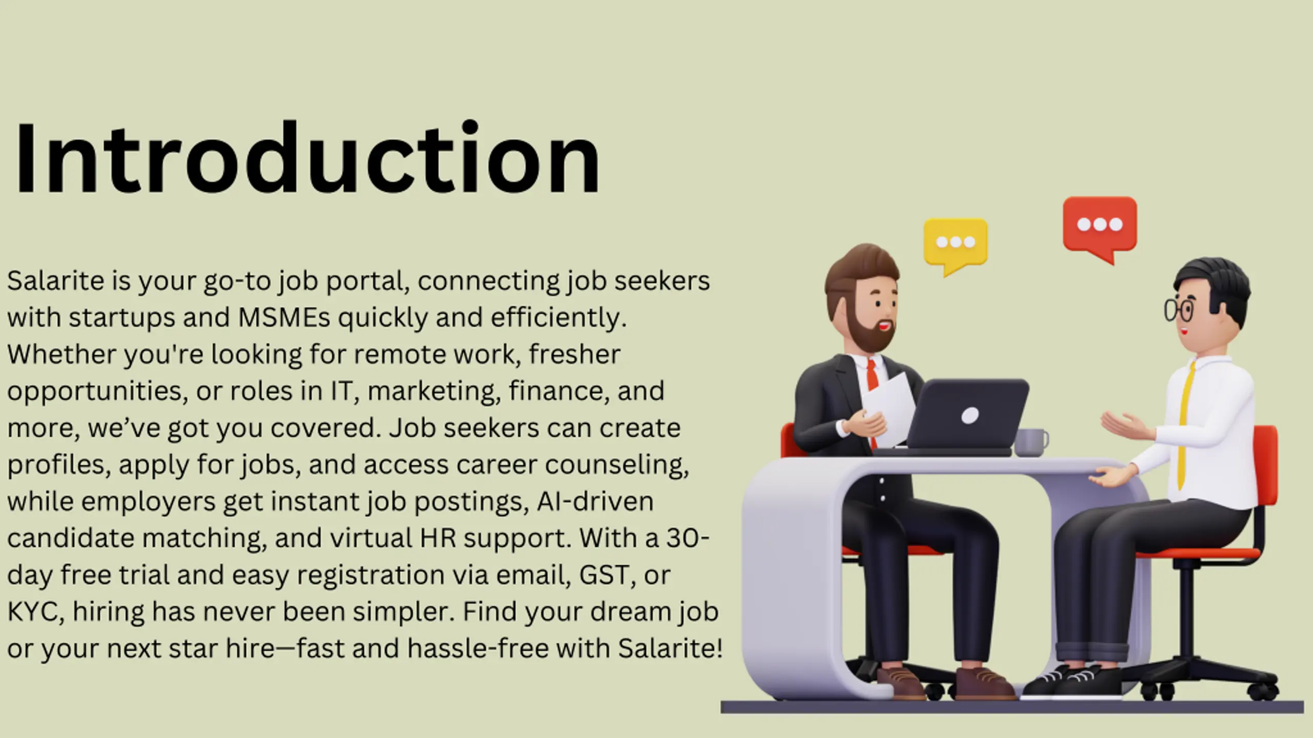 Introduction Salarite is your go-to job portal, connecting job seekers with startups and MSMEs quickly and efficiently. Whether you're looking for remote work, fresher opportunities, or roles in IT, marketing, finance, and more, we ve got you covered. Job seekers can create profiles, apply for jobs, and access career counseling, while employers get instant job postings, AI-driven candidate matching, and virtual HR support. With a 30- day free trial and easy registration via email, GST, or KYC, hiring has never been simpler. Find your dream job or your next star hire fast and hassle-free with Salarite!
