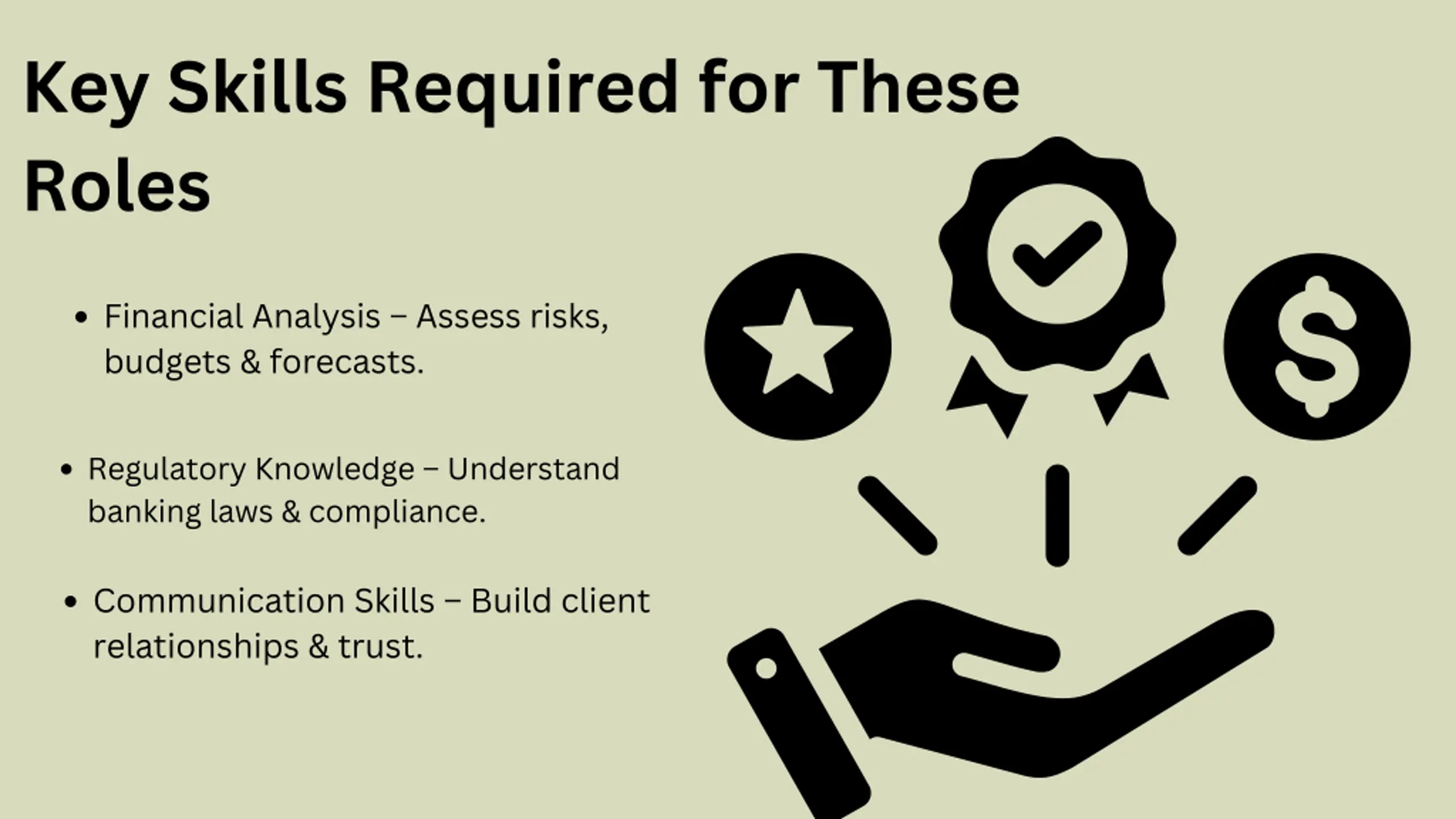 Key Skills Required for These Roles Financial Analysis Assess risks, budgets & forecasts. Regulatory Knowledge Understand banking laws & compliance. Communication Skills Build client relationships & trust.