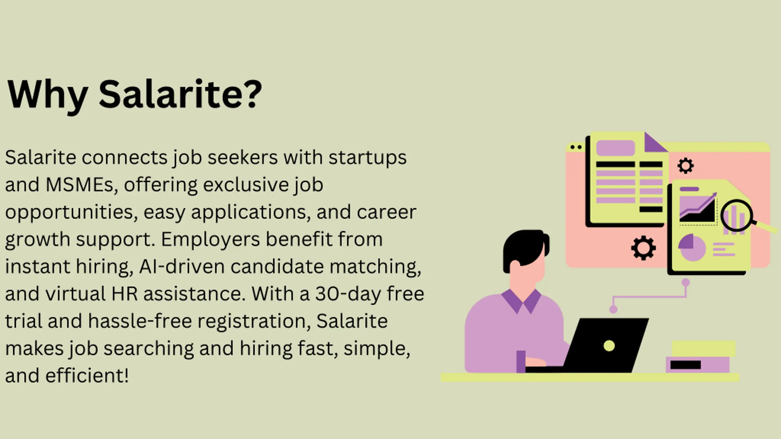 Why Salarite? Salarite connects job seekers with startups and MSMEs, offering exclusive job opportunities, easy applications, and career growth support. Employers benefit from instant hiring, AI-driven candidate matching, and virtual HR assistance. With a 30-day free trial and hassle-free registration, Salarite makes job searching and hiring fast, simple, and efficient!
