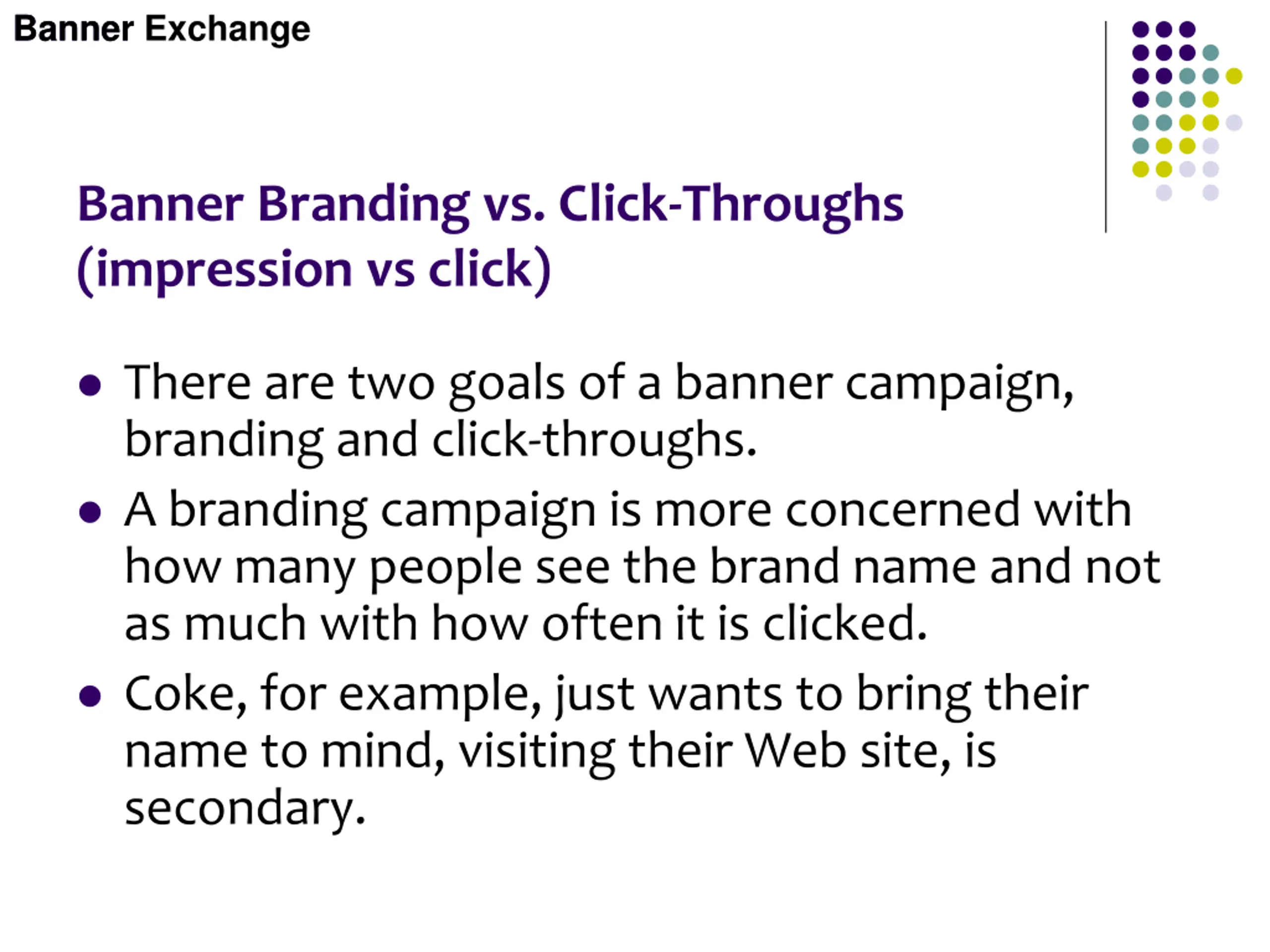 Banner Banner Exchange Banner Branding vs. Click-Throughs (impression vs click) There are two goals of a banner campaign, branding and click-throughs. A branding campaign is more concerned with how many people see the brand name and not as much with how often it is clicked. Coke, for example, just wants to bring their name to mind, visiting their Web site, is secondary.