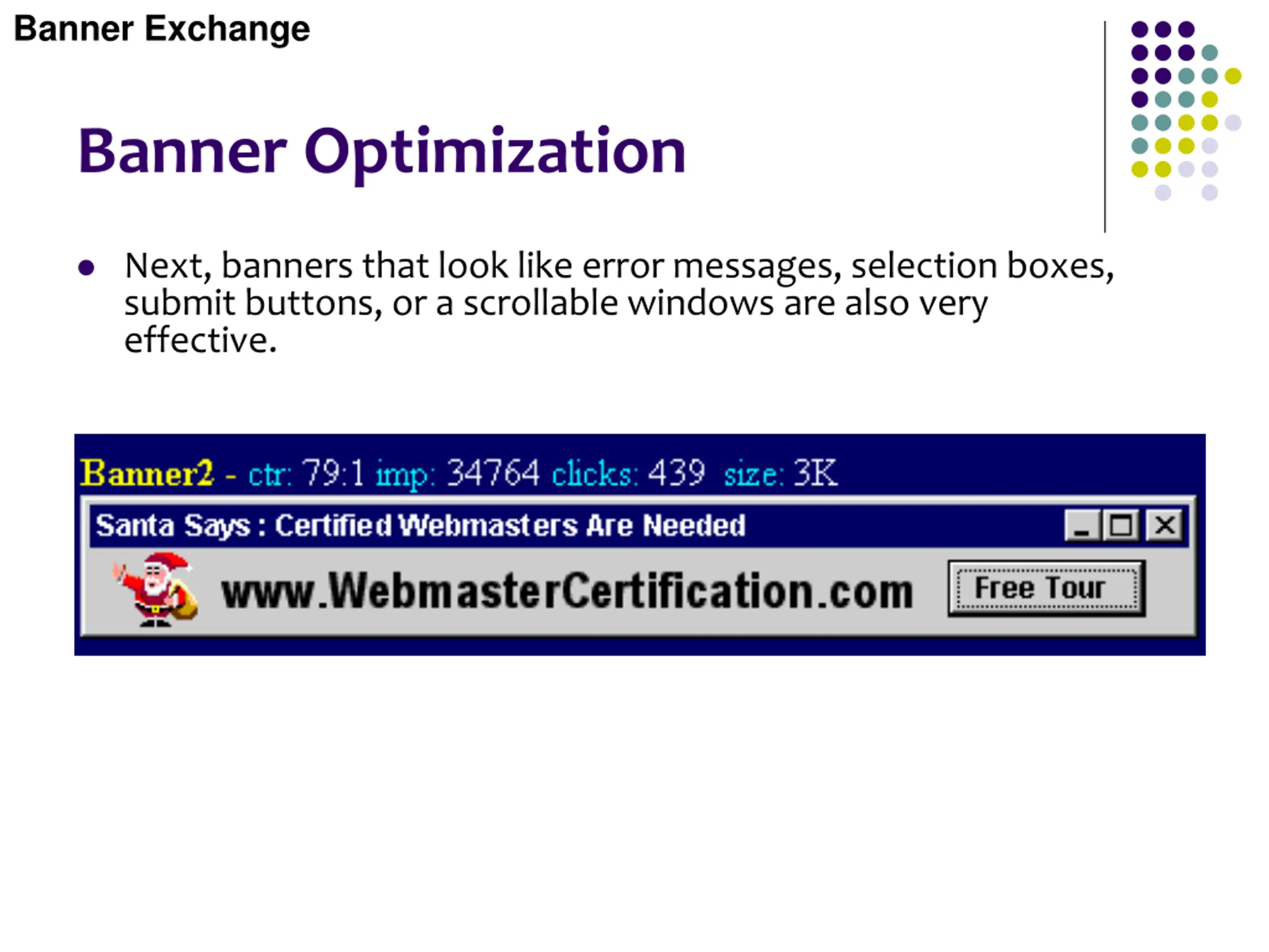 Banner Exchange Banner Optimization Next, banners that look like error messages, selection boxes, submit buttons, or a scrollable windows are also very effective.