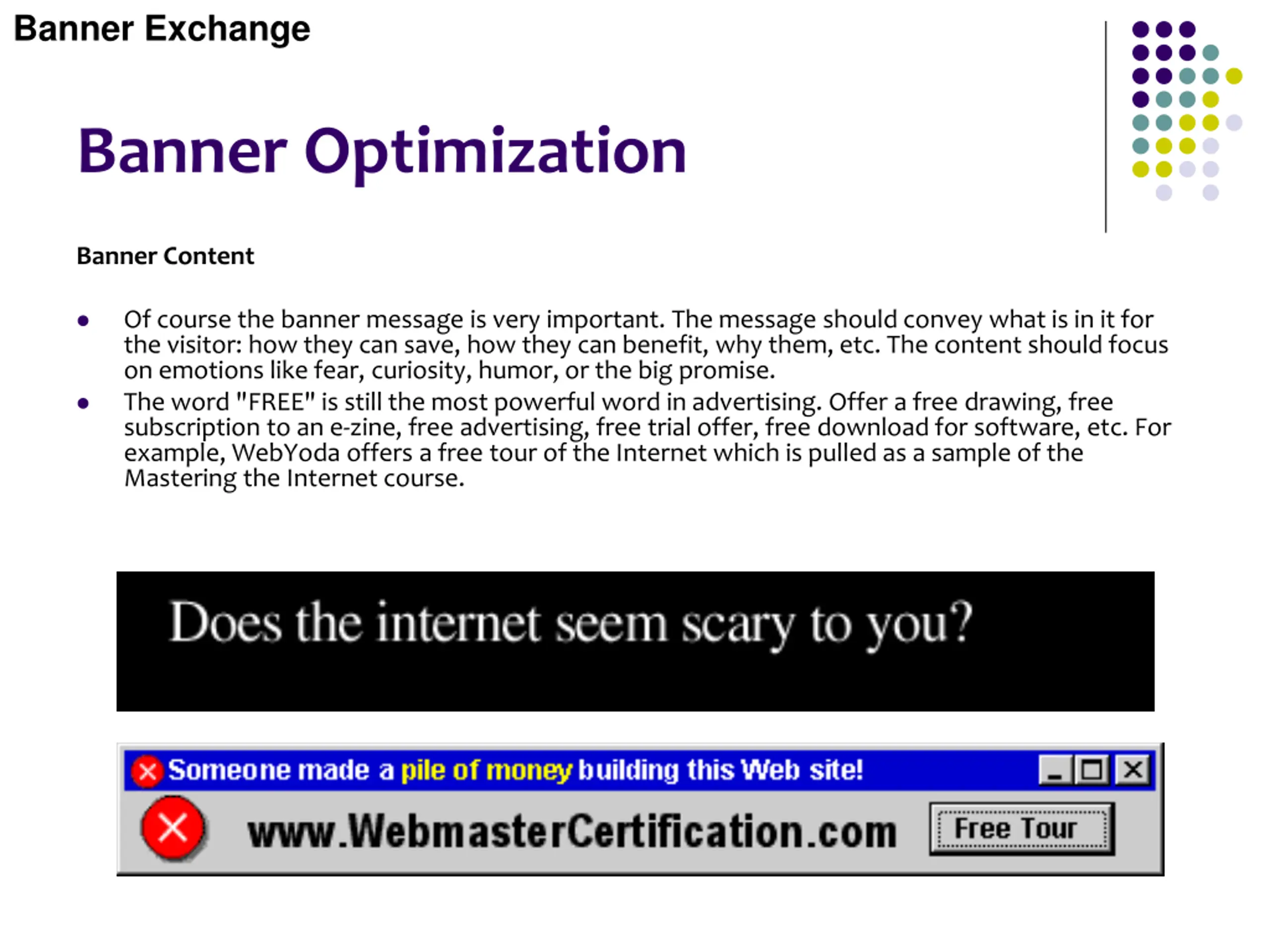 Banner Exchange Banner Optimization Banner Content Of course the banner message is very important. The message should convey what is in it for the visitor: how they can save, how they can benefit, why them, etc. The content should focus on emotions like fear, curiosity, humor, or the big promise. The word "FREE" is still the most powerful word in advertising. Offer a free drawing, free subscription to an e-zine, free advertising, free trial offer, free download for software, etc. For example, WebYoda offers a free tour of the Internet which is pulled as a sample of the Mastering the Internet course.