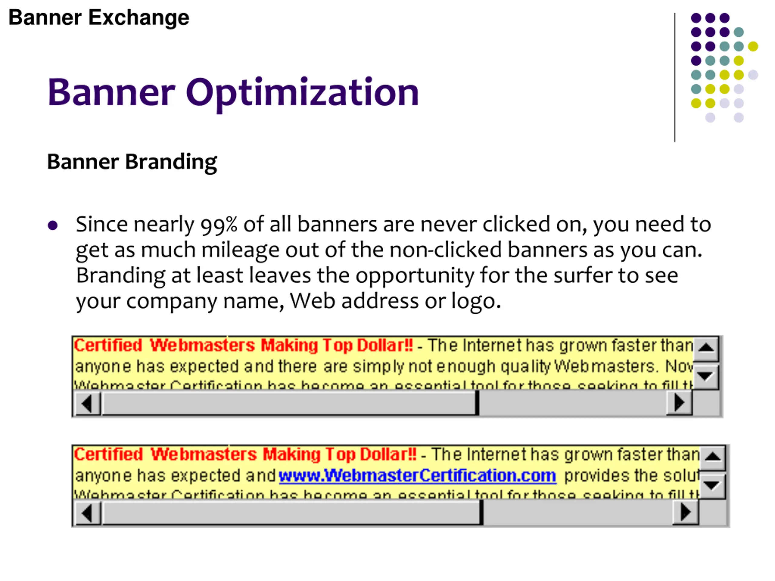 Banner Exchange Banner Optimization Banner Branding Since nearly 99% of all banners are never clicked on, you need to get as much mileage out of the non-clicked banners as you can. Branding at least leaves the opportunity for the surfer to see your company name, Web address or logo.