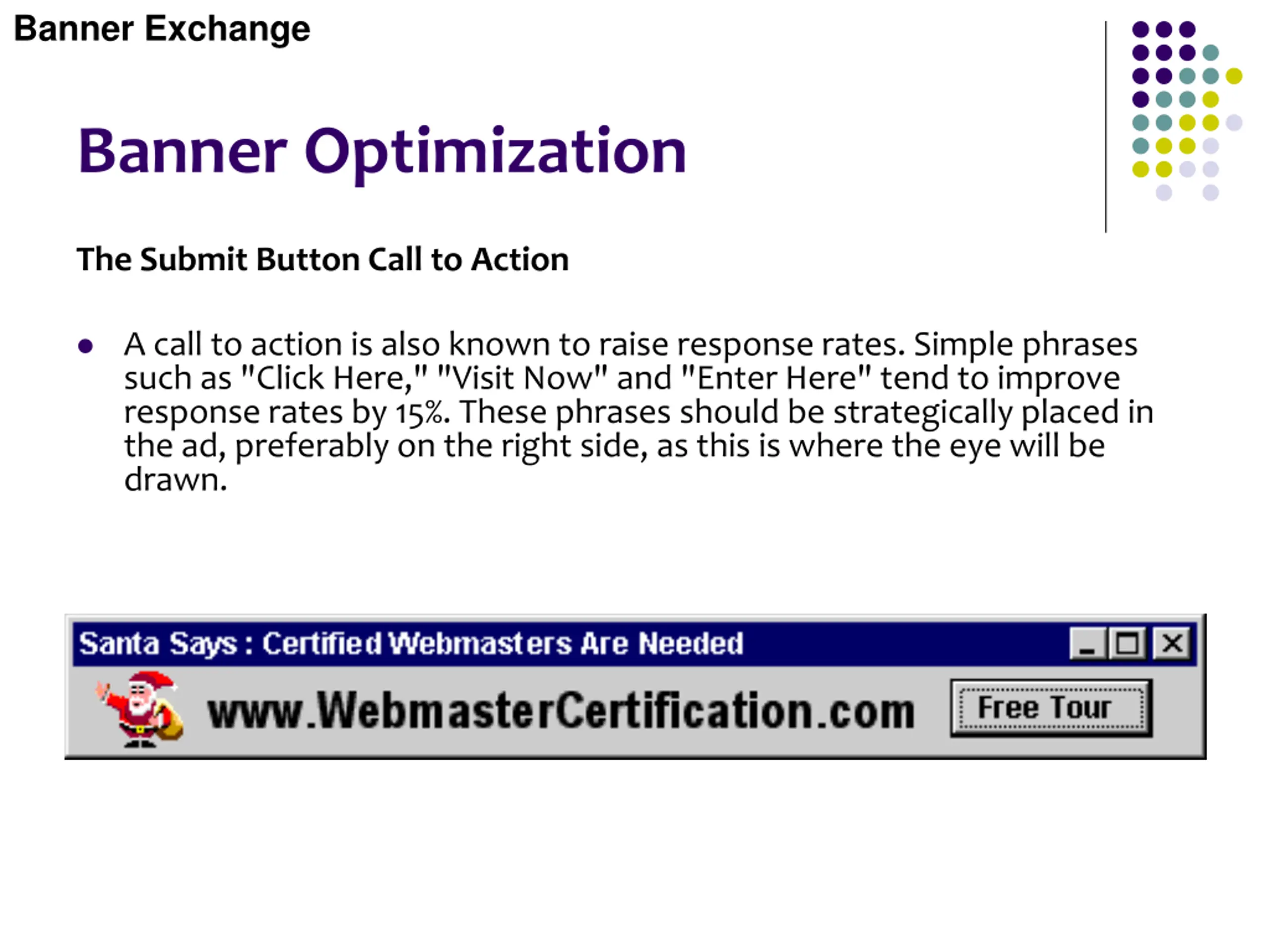Banner Exchange Banner Optimization The Submit Button Call to Action A call to action is also known to raise response rates. Simple phrases such as "Click Here," "Visit Now" and "Enter Here" tend to improve response rates by 15%. These phrases should be strategically placed in the ad, preferably on the right side, as this is where the eye will be drawn.