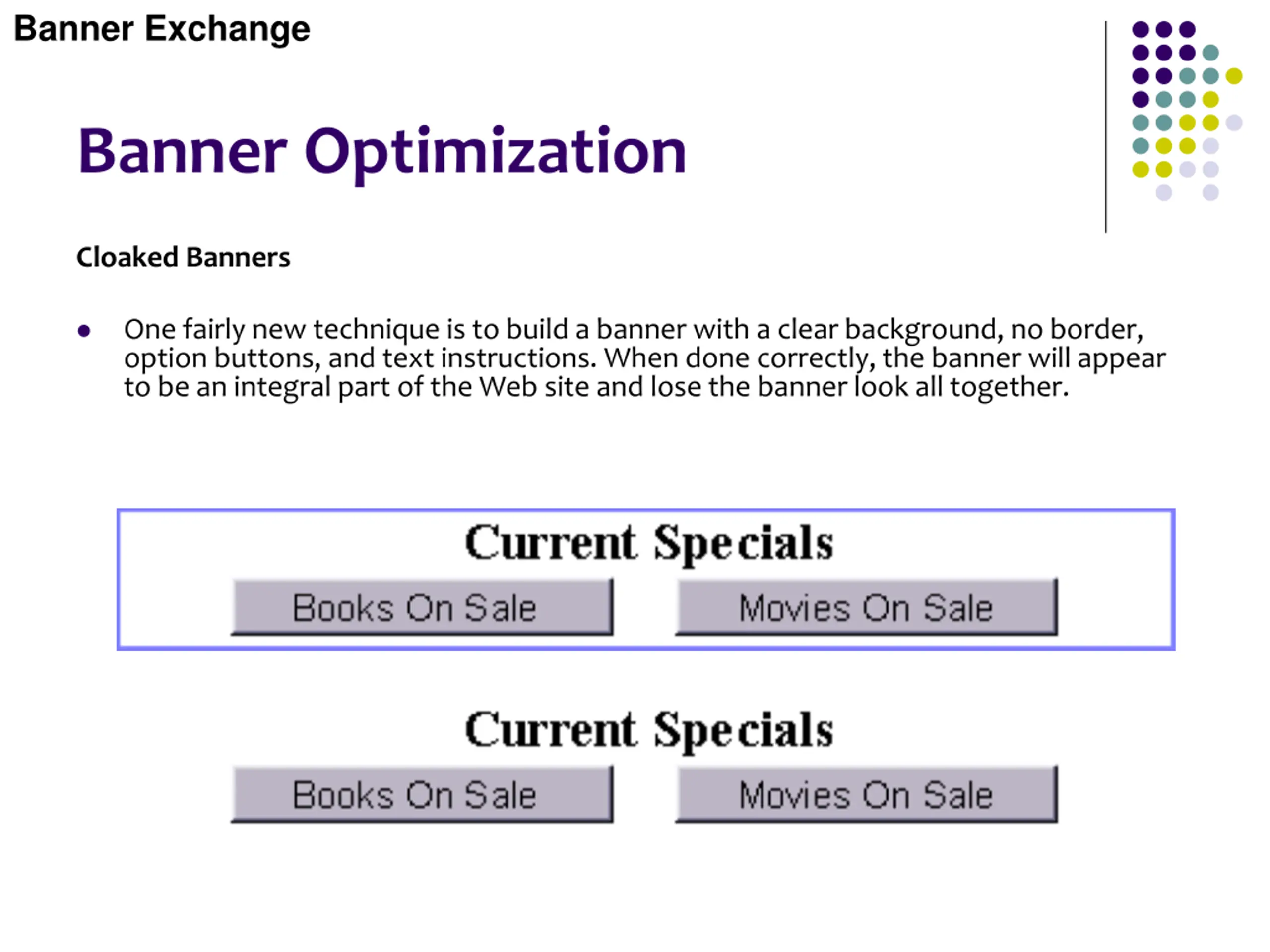 Banner Exchange Banner Optimization Cloaked Banners One fairly new technique is to build a banner with a clear background, no border, option buttons, and text instructions. When done correctly, the banner will appear to be an integral part of the Web site and lose the banner look all together.
