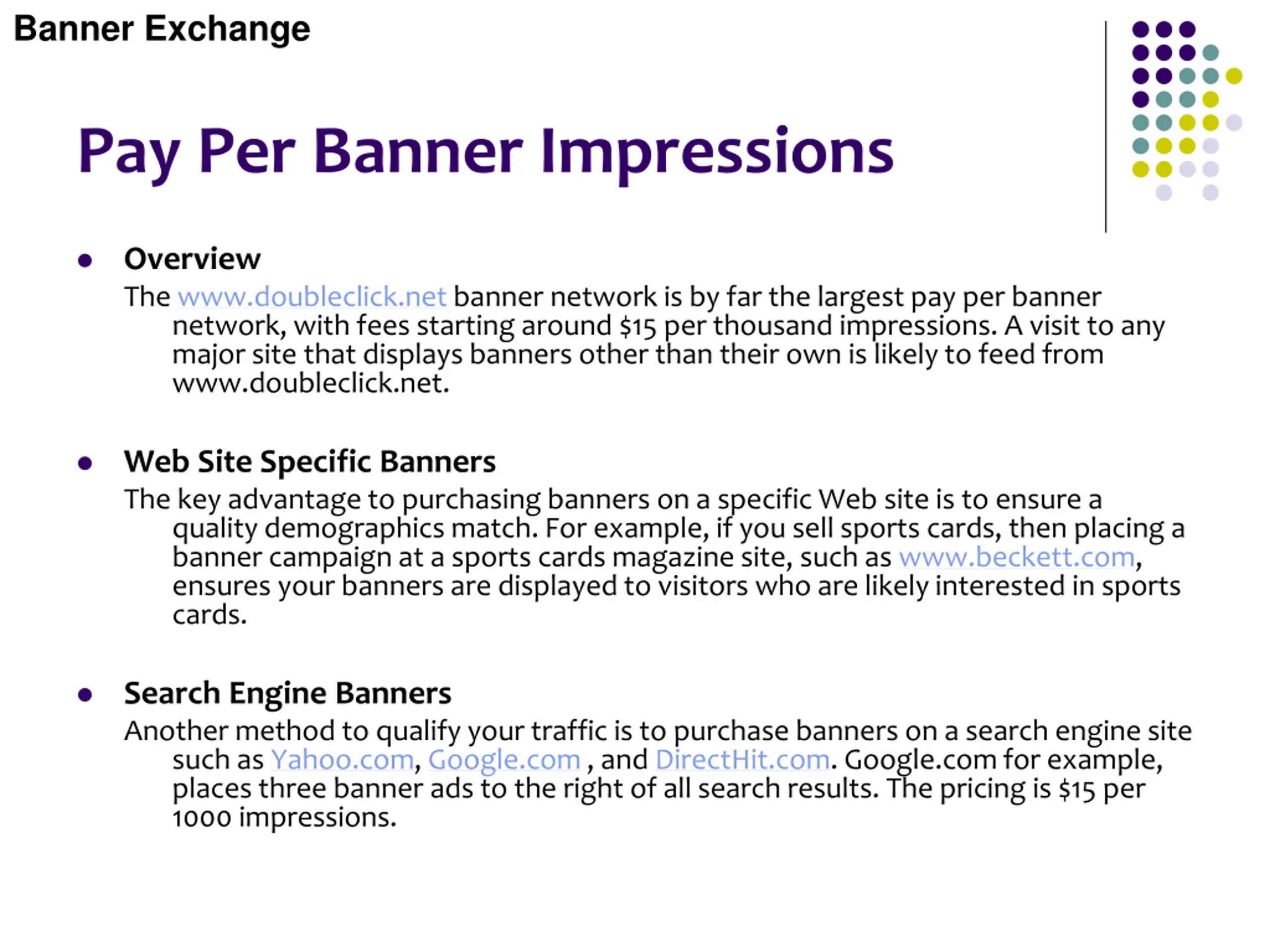 Banner Exchange Pay Per Banner Impressions Overview The www.doubleclick.net banner network is by far the largest pay per banner network, with fees starting around $15 per thousand impressions. A visit to any major site that displays banners other than their own is likely to feed from www.doubleclick.net. Web Site Specific Banners The key advantage to purchasing banners on a specific Web site is to ensure a quality demographics match. For example, if you sell sports cards, then placing a banner campaign at a sports cards magazine site, such as www.beckett.com, ensures your banners are displayed to visitors who are likely interested in sports cards. Search Engine Banners Another method to qualify your traffic is to purchase banners on a search engine site such as Yahoo.com, Google.com , and DirectHit.com. Google.com for example, places three banner ads to the right of all search results. The pricing is $15 per 1000 impressions.