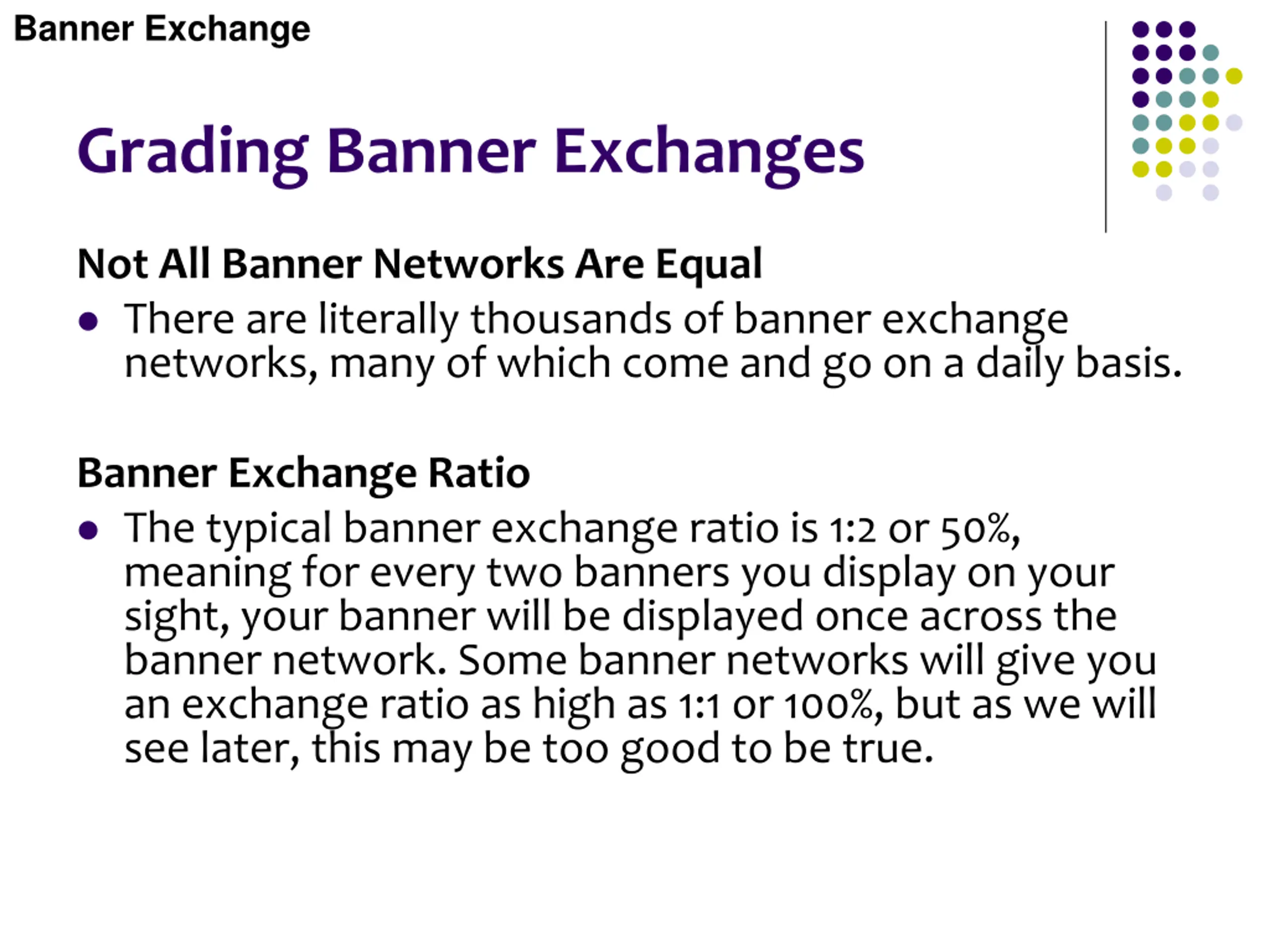 Banner Exchange Grading Banner Exchanges Not All Banner Networks Are Equal There are literally thousands of banner exchange networks, many of which come and go on a daily basis. Banner Exchange Ratio The typical banner exchange ratio is 1:2 or 50%, meaning for every two banners you display on your sight, your banner will be displayed once across the banner network. Some banner networks will give you an exchange ratio as high as 1:1 or 100%, but as we will see later, this may be too good to be true.