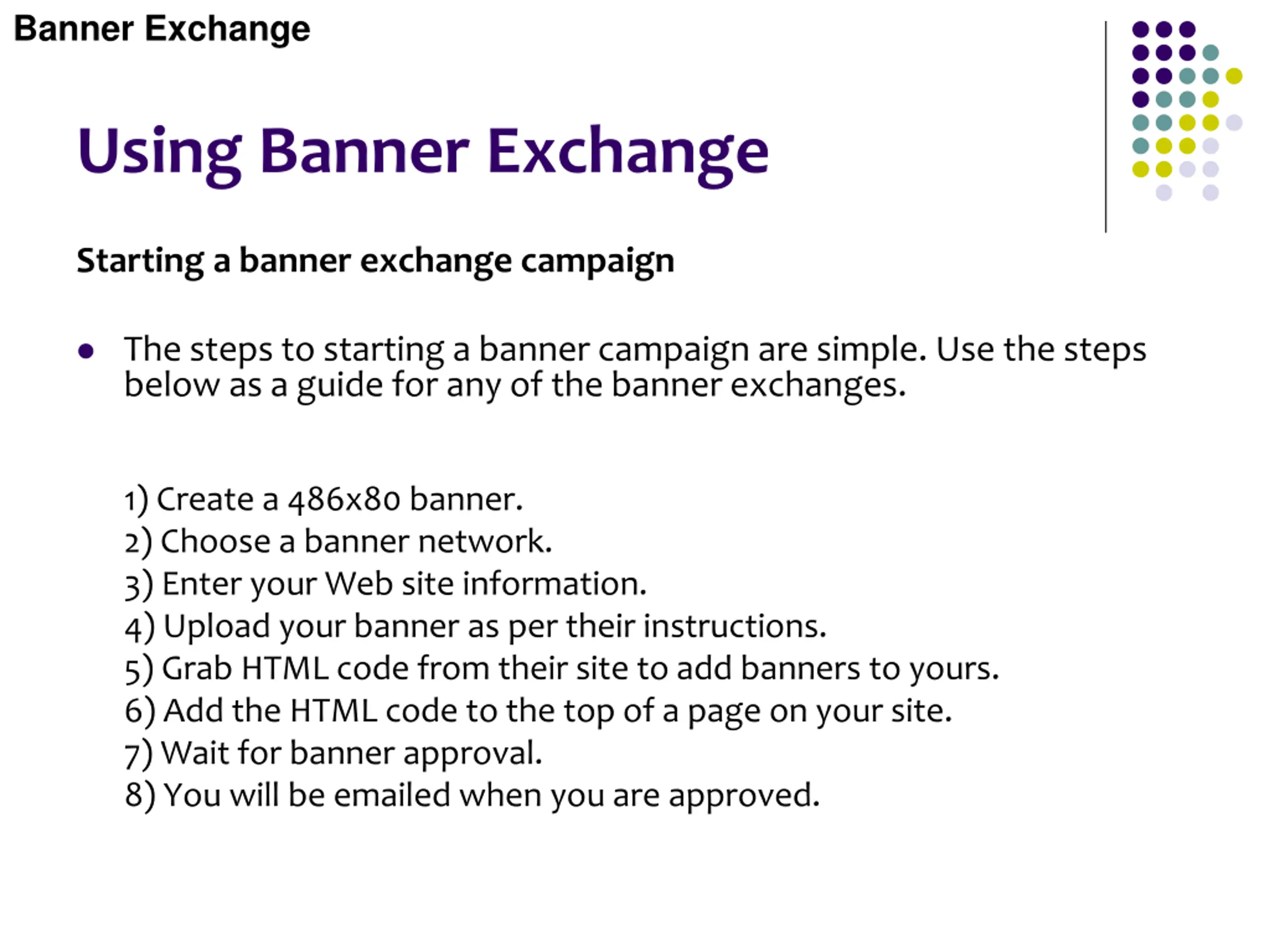 Banner Exchange Using Banner Exchange Starting a banner exchange campaign The steps to starting a banner campaign are simple. Use the steps below as a guide for any of the banner exchanges. 1) Create a 486x80 banner. 2) Choose a banner network. 3) Enter your Web site information. 4) Upload your banner as per their instructions. 5) Grab HTML code from their site to add banners to yours. 6) Add the HTML code to the top of a page on your site. 7) Wait for banner approval. 8) You will be emailed when you are approved.