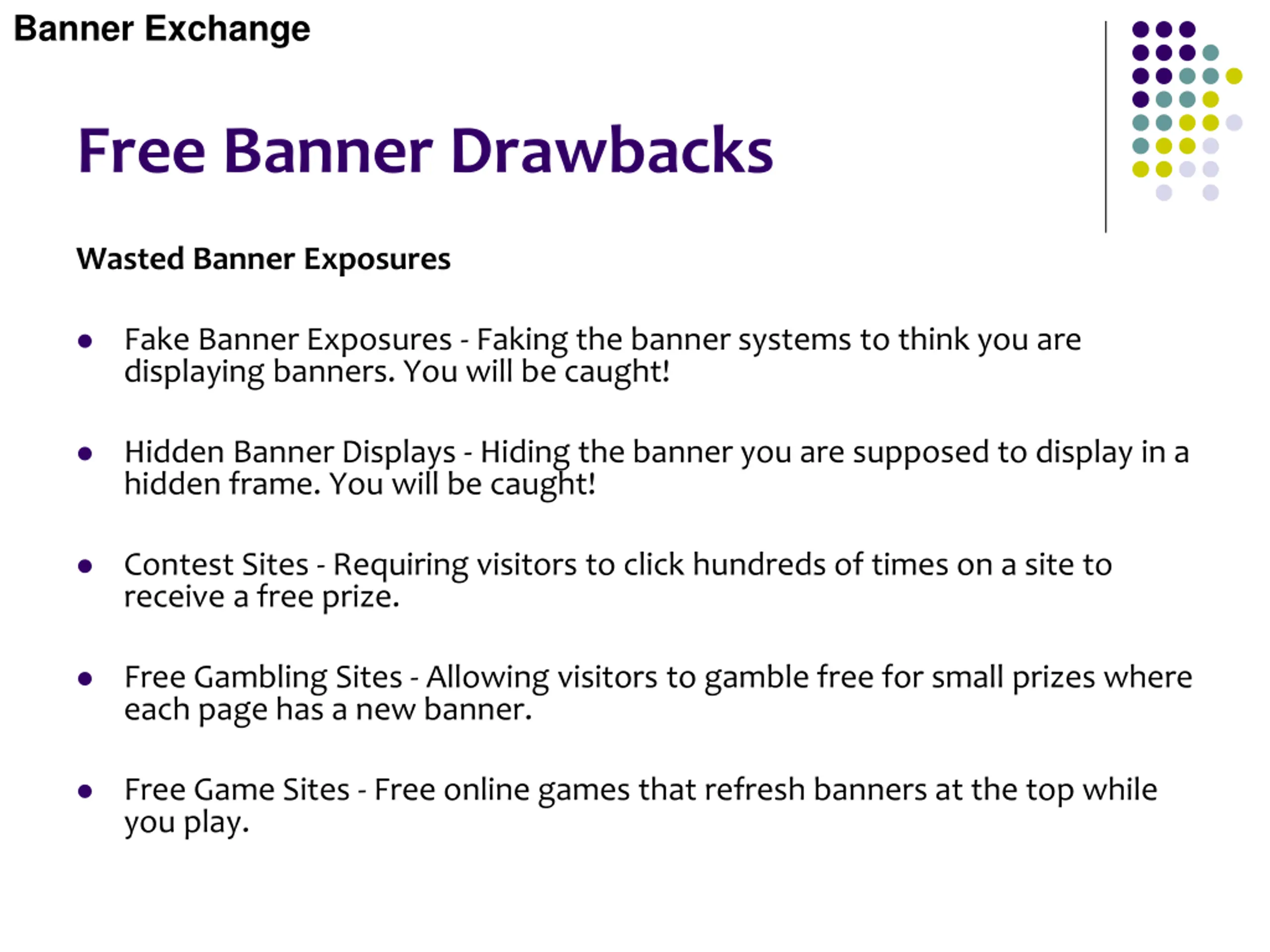Banner Exchange Free Banner Drawbacks Wasted Banner Exposures Fake Banner Exposures - Faking the banner systems to think you are displaying banners. You will be caught! Hidden Banner Displays - Hiding the banner you are supposed to display in a hidden frame. You will be caught! Contest Sites - Requiring visitors to click hundreds of times on a site to receive a free prize. Free Gambling Sites - Allowing visitors to gamble free for small prizes where each page has a new banner. Free Game Sites - Free online games that refresh banners at the top while you play.