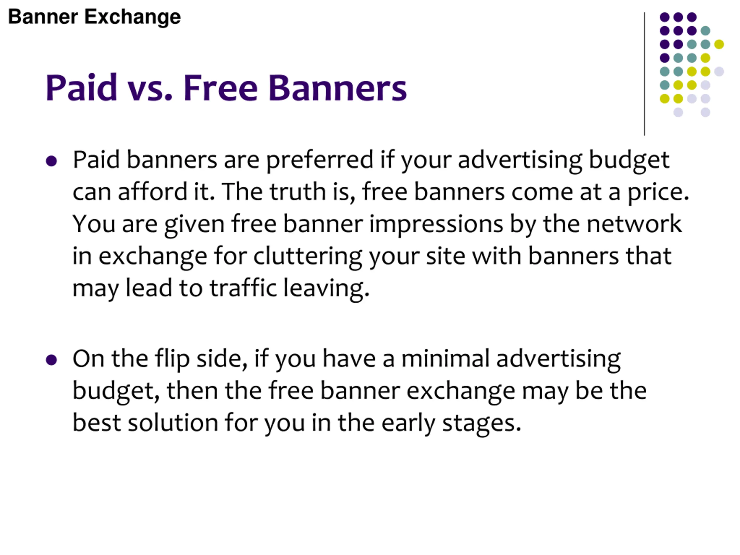 Banner Exchange Paid vs. Free Banners Paid banners are preferred if your advertising budget can afford it. The truth is, free banners come at a price. You are given free banner impressions by the network in exchange for cluttering your site with banners that may lead to traffic leaving. On the flip side, if you have a minimal advertising budget, then the free banner exchange may be the best solution for you in the early stages.