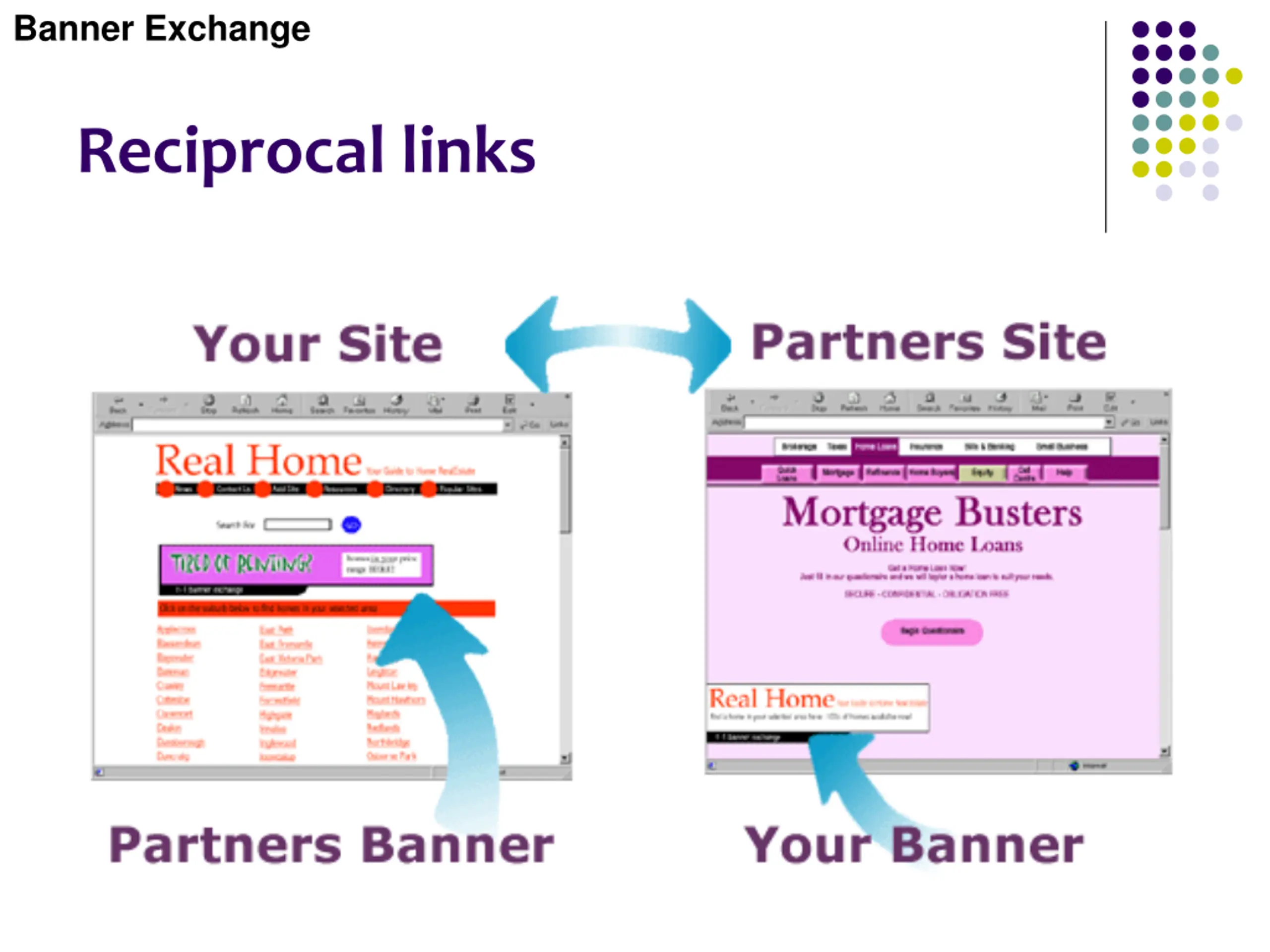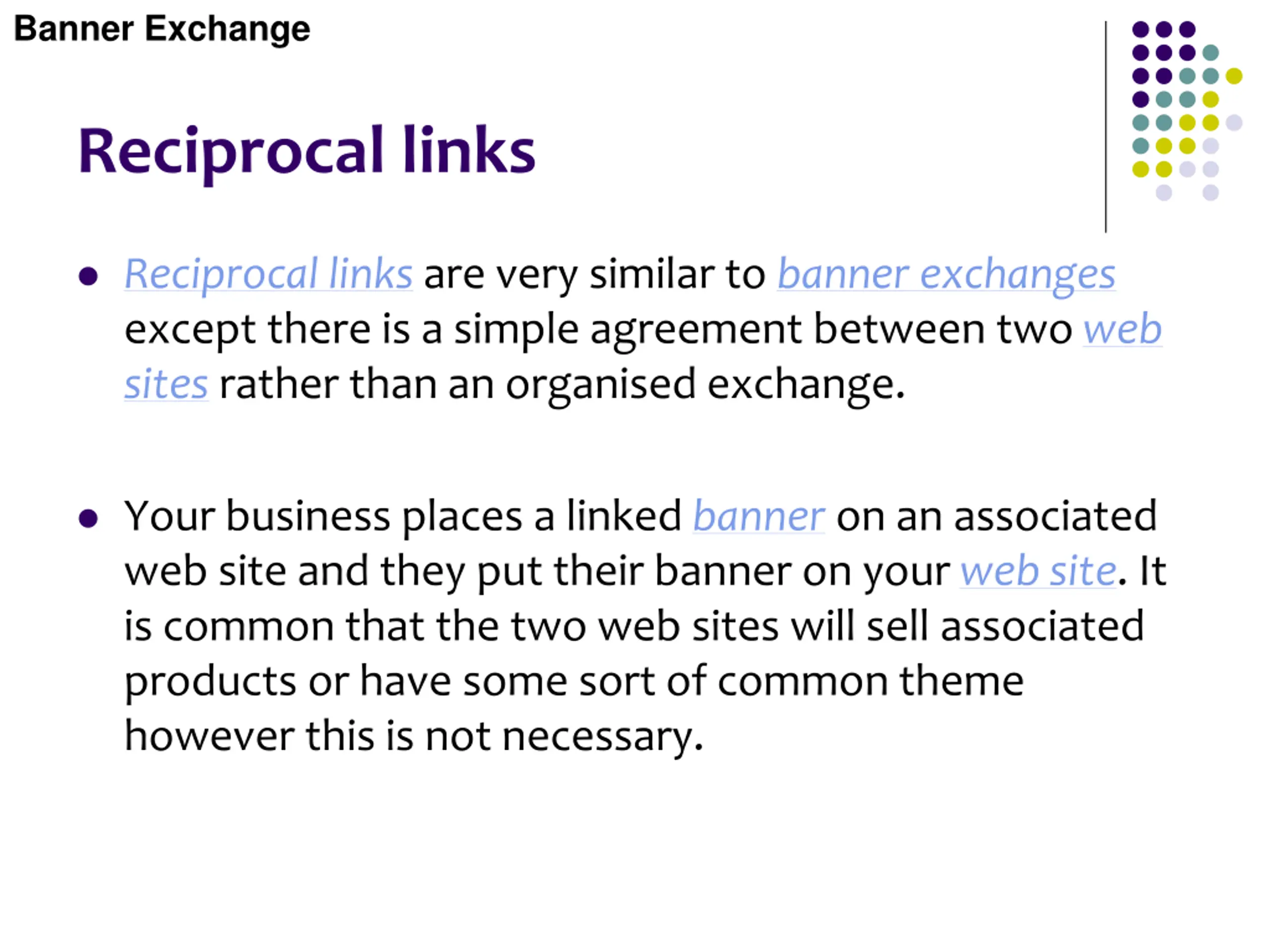 Banner Exchange Reciprocal links Reciprocal links are very similar to banner exchanges except there is a simple agreement between two web sites rather than an organised exchange. Your business places a linked banner on an associated web site and they put their banner on your web site. It is common that the two web sites will sell associated products or have some sort of common theme however this is not necessary.