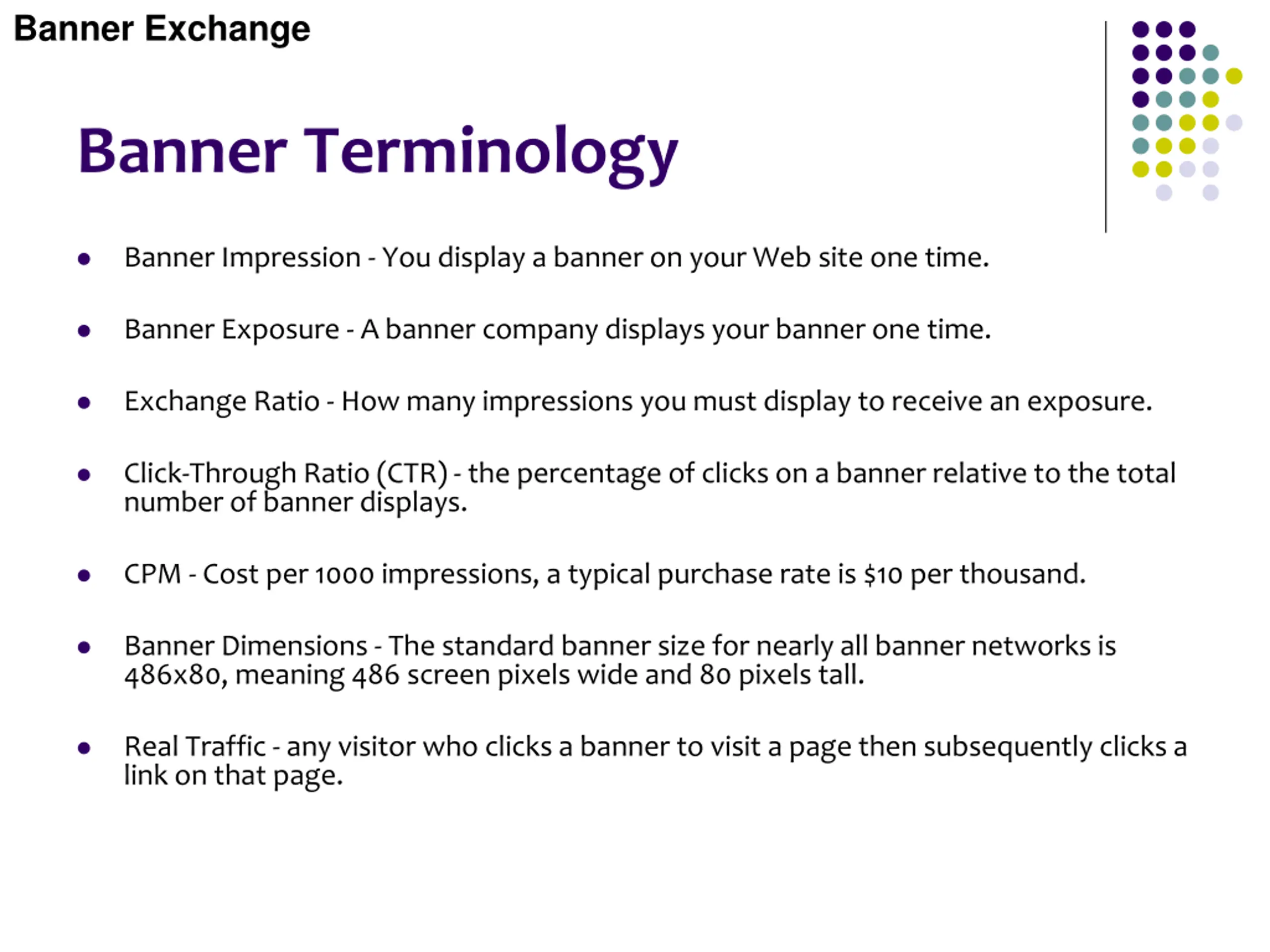 Banner Exchange Banner Terminology Banner Impression - You display a banner on your Web site one time. Banner Exposure - A banner company displays your banner one time. Exchange Ratio - How many impressions you must display to receive an exposure. Click-Through Ratio (CTR) - the percentage of clicks on a banner relative to the total number of banner displays. CPM - Cost per 1000 impressions, a typical purchase rate is $10 per thousand. Banner Dimensions - The standard banner size for nearly all banner networks is 486x80, meaning 486 screen pixels wide and 80 pixels tall. Real Traffic - any visitor who clicks a banner to visit a page then subsequently clicks a link on that page.