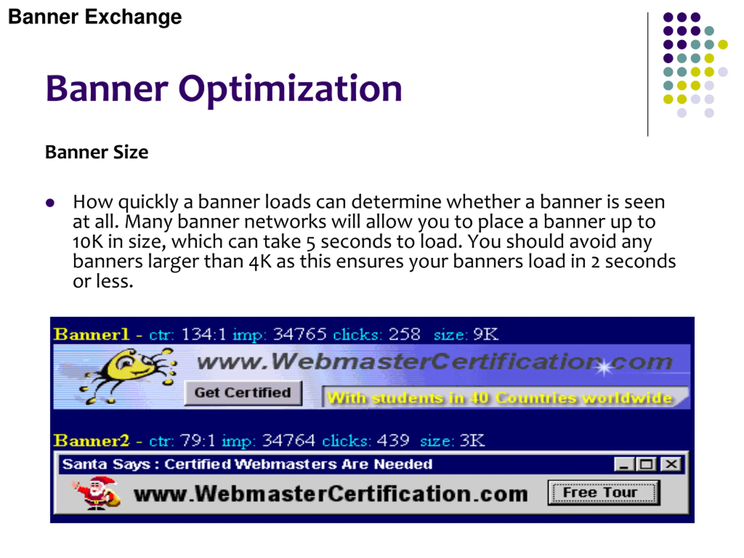 Banner Exchange Banner Optimization Banner Size How quickly a banner loads can determine whether a banner is seen at all. Many banner networks will allow you to place a banner up to 10K in size, which can take 5 seconds to load. You should avoid any banners larger than 4K as this ensures your banners load in 2 seconds or less.
