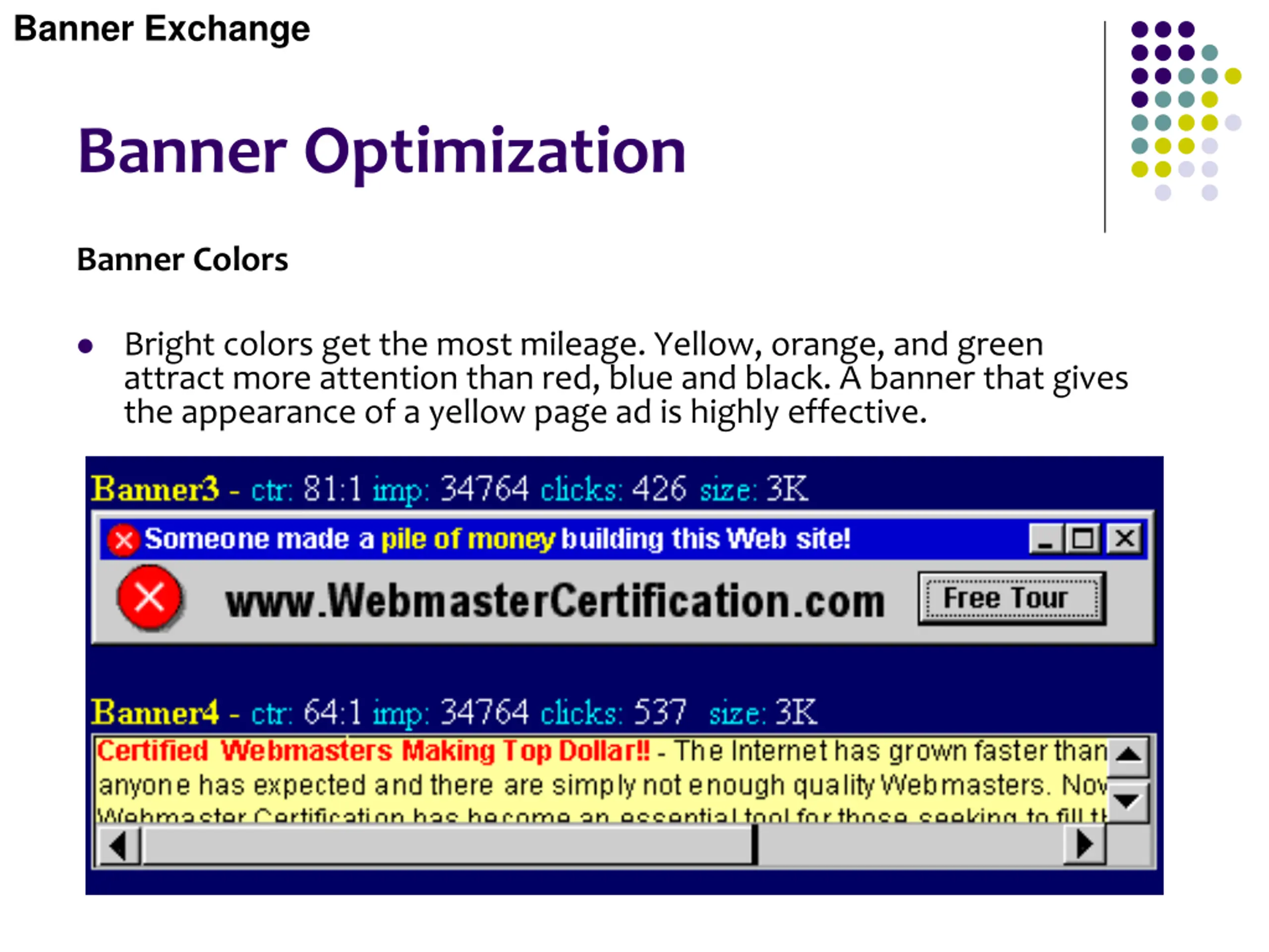 Banner Exchange Banner Optimization Banner Colors Bright colors get the most mileage. Yellow, orange, and green attract more attention than red, blue and black. A banner that gives the appearance of a yellow page ad is highly effective.
