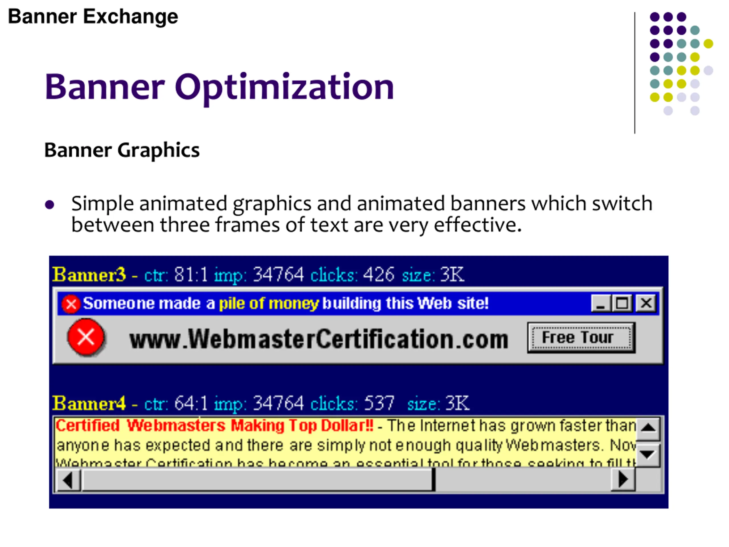 Banner Exchange Banner Optimization Banner Graphics Simple animated graphics and animated banners which switch between three frames of text are very effective.