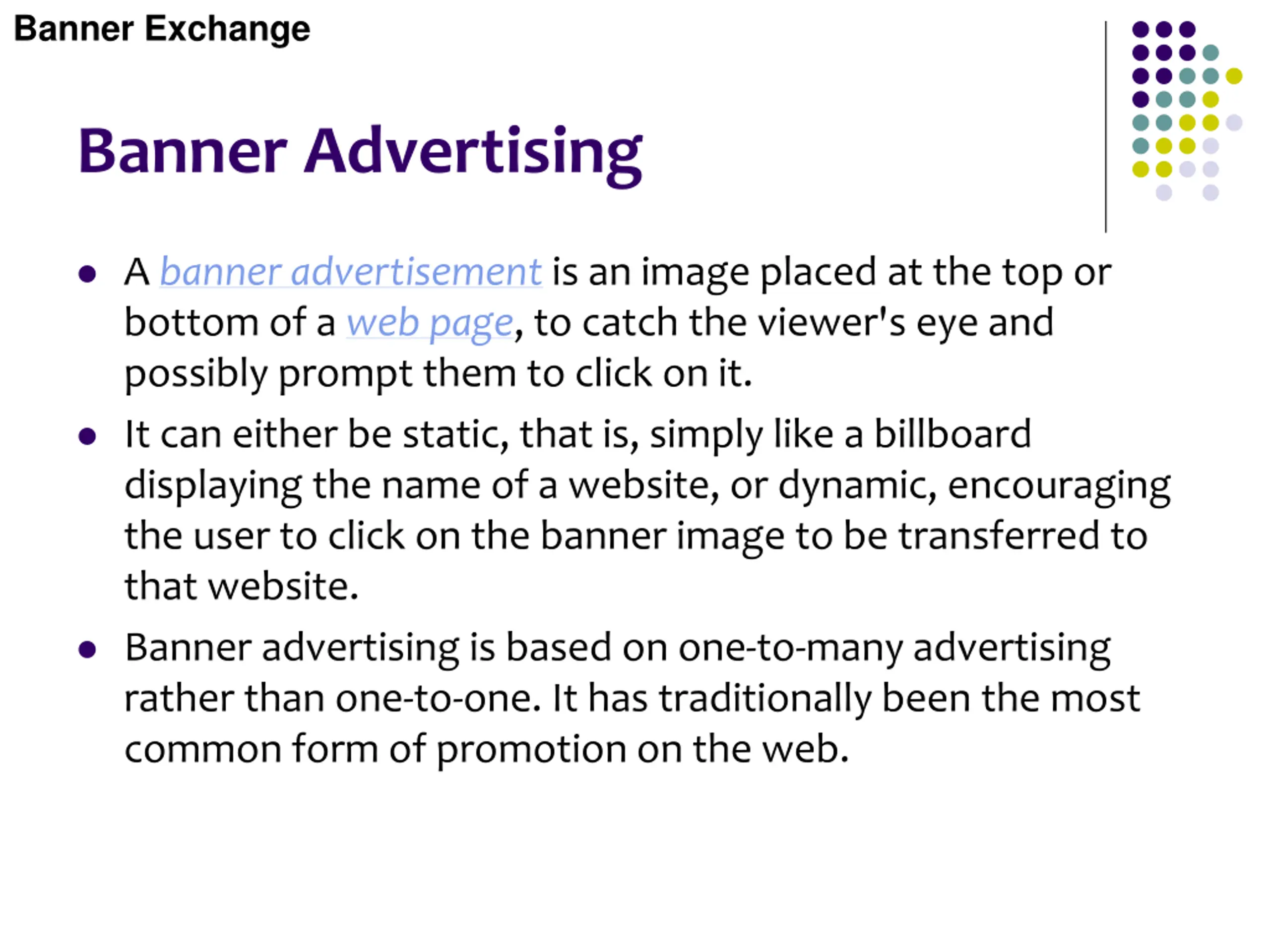 Banner Exchange Banner Advertising A banner advertisement is an image placed at the top or bottom of a web page, to catch the viewer's eye and possibly prompt them to click on it. It can either be static, that is, simply like a billboard displaying the name of a website, or dynamic, encouraging the user to click on the banner image to be transferred to that website. Banner advertising is based on one-to-many advertising rather than one-to-one. It has traditionally been the most common form of promotion on the web.
