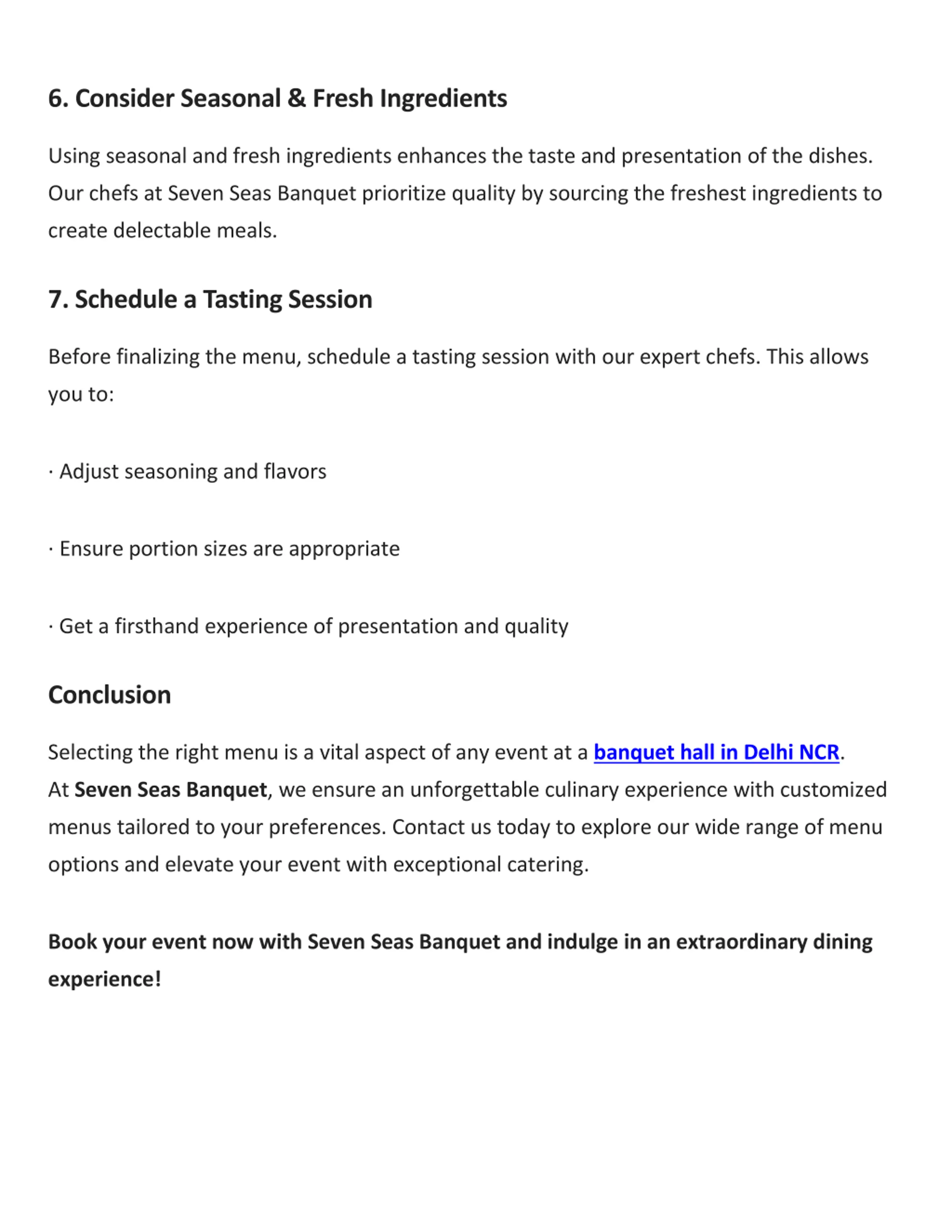6. Consider Seasonal & Fresh Ingredients Using seasonal and fresh ingredients enhances the taste and presentation of the dishes. Our chefs at Seven Seas Banquet prioritize quality by sourcing the freshest ingredients to create delectable meals. 7. Schedule a Tasting Session Before finalizing the menu, schedule a tasting session with our expert chefs. This allows you to: Adjust seasoning and flavors Ensure portion sizes are appropriate Get a firsthand experience of presentation and quality Conclusion Selecting the right menu is a vital aspect of any event at a banquet hall in Delhi NCR. At Seven Seas Banquet, we ensure an unforgettable culinary experience with customized menus tailored to your preferences. Contact us today to explore our wide range of menu options and elevate your event with exceptional catering. Book your event now with Seven Seas Banquet and indulge in an extraordinary dining experience!