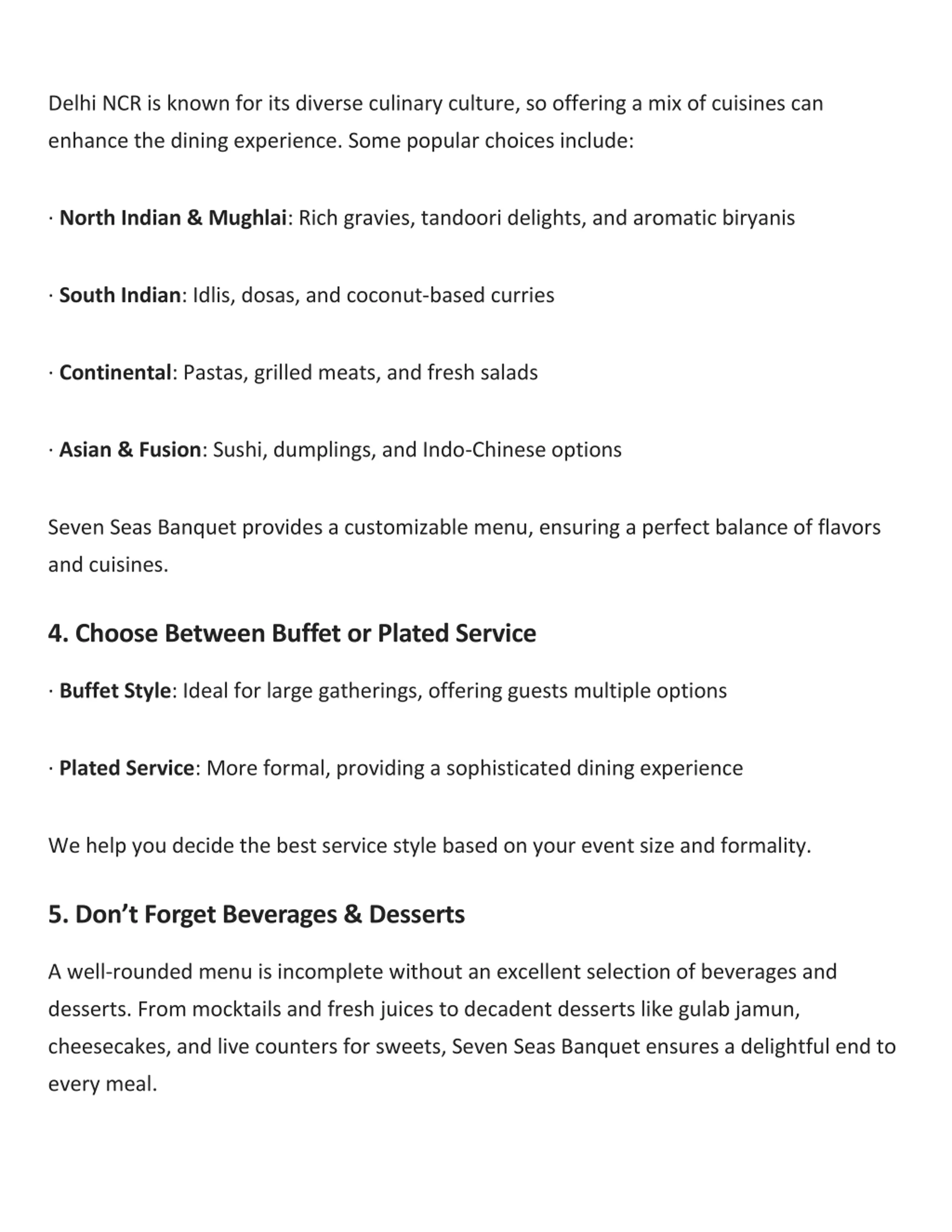 Delhi NCR is known for its diverse culinary culture, so offering a mix of cuisines can enhance the dining experience. Some popular choices include: North Indian & Mughlai: Rich gravies, tandoori delights, and aromatic biryanis South Indian: Idlis, dosas, and coconut-based curries Continental: Pastas, grilled meats, and fresh salads Asian & Fusion: Sushi, dumplings, and Indo-Chinese options Seven Seas Banquet provides a customizable menu, ensuring a perfect balance of flavors and cuisines. 4. Choose Between Buffet or Plated Service Buffet Style: Ideal for large gatherings, offering guests multiple options Plated Service: More formal, providing a sophisticated dining experience We help you decide the best service style based on your event size and formality. 5. Don t Forget Beverages & Desserts A well-rounded menu is incomplete without an excellent selection of beverages and desserts. From mocktails and fresh juices to decadent desserts like gulab jamun, cheesecakes, and live counters for sweets, Seven Seas Banquet ensures a delightful end to every meal.