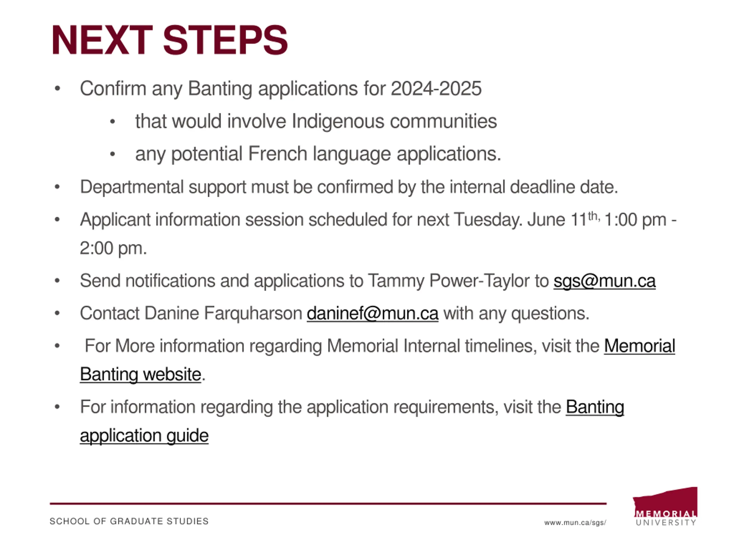 NEXT STEPS Confirm any Banting applications for 2024-2025 that would involve Indigenous communities any potential French language applications. Departmental support must be confirmed by the internal deadline date. Applicant information session scheduled for next Tuesday. June 11th, 1:00 pm - 2:00 pm. Send notifications and applications to Tammy Power-Taylor to sgs@mun.ca Contact Danine Farquharson daninef@mun.ca with any questions. For More information regarding Memorial Internal timelines, visit the Memorial Banting website. For information regarding the application requirements, visit the Banting application guide SCHOOL OF GRADUATE STUDIES www.mun.ca/sgs/