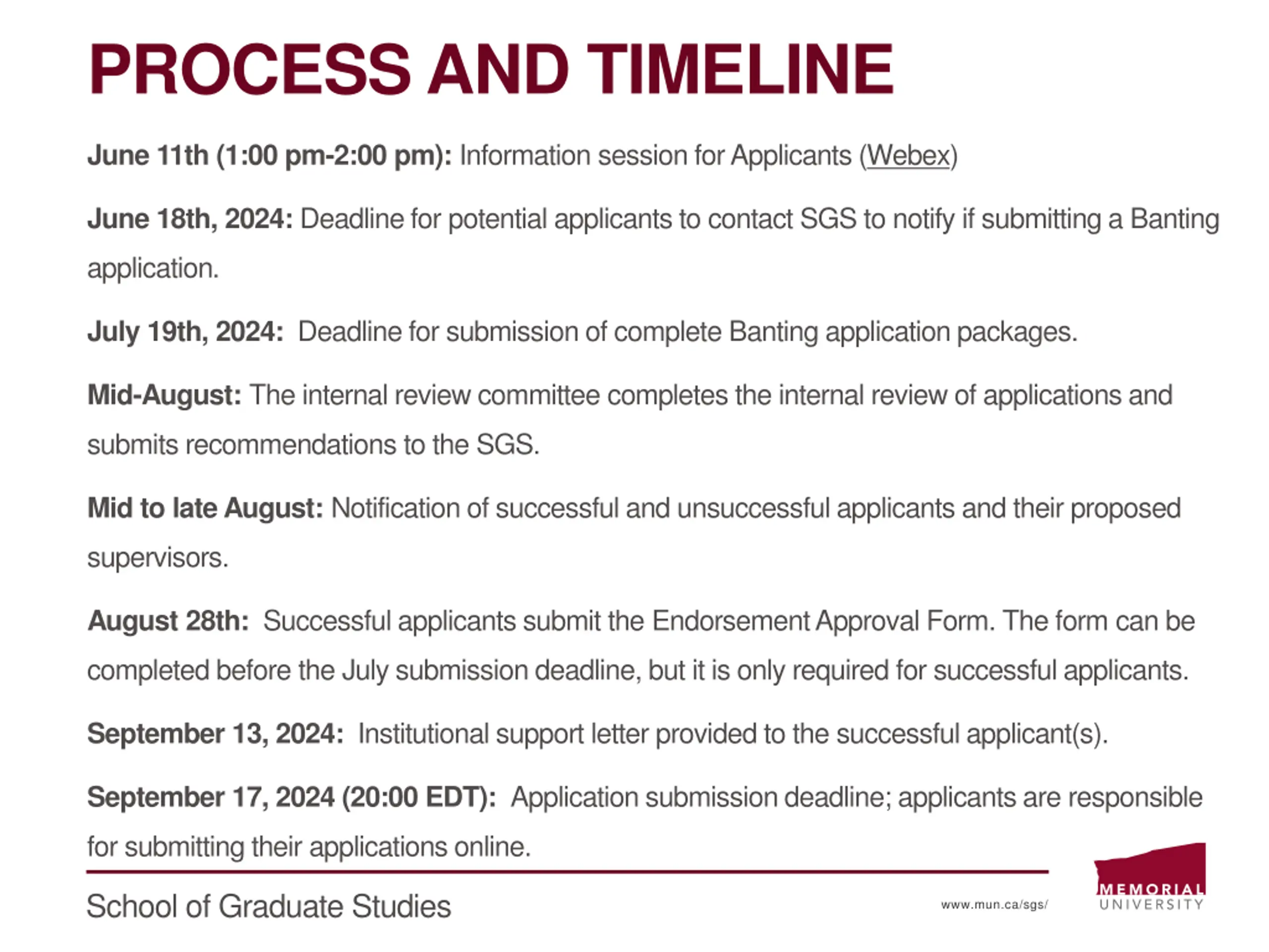 PROCESS AND TIMELINE June 11th (1:00 pm-2:00 pm): Information session for Applicants (Webex) June 18th, 2024: Deadline for potential applicants to contact SGS to notify if submitting a Banting application. July 19th, 2024: Deadline for submission of complete Banting application packages. Mid-August: The internal review committee completes the internal review of applications and submits recommendations to the SGS. Mid to late August: Notification of successful and unsuccessful applicants and their proposed supervisors. August 28th: Successful applicants submit the Endorsement Approval Form. The form can be completed before the July submission deadline, but it is only required for successful applicants. September 13, 2024: Institutional support letter provided to the successful applicant(s). September 17, 2024 (20:00 EDT): Application submission deadline; applicants are responsible for submitting their applications online. School of Graduate Studies www.mun.ca/sgs/