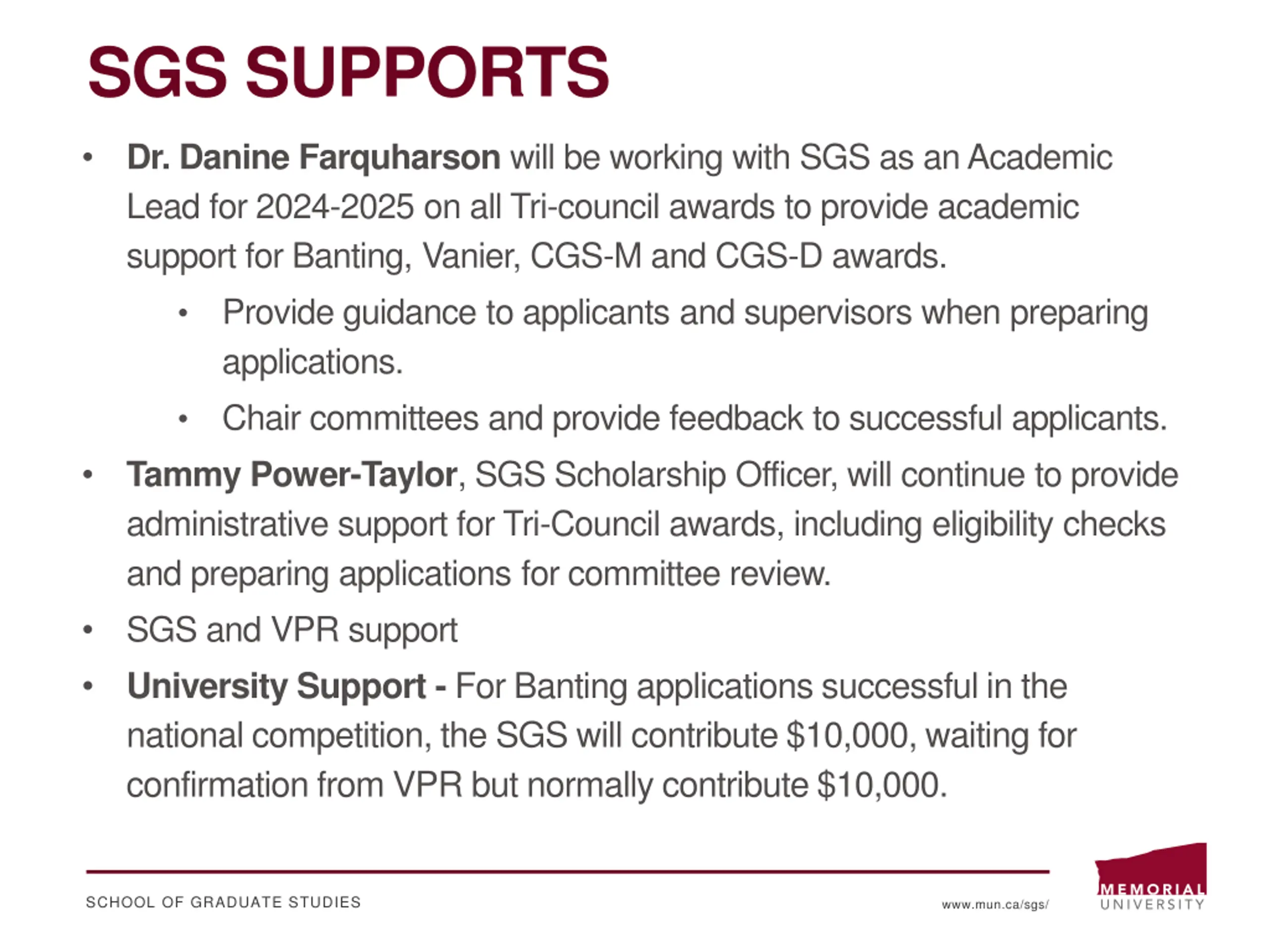 SGS SUPPORTS Dr. Danine Farquharson will be working with SGS as an Academic Lead for 2024-2025 on all Tri-council awards to provide academic support for Banting, Vanier, CGS-M and CGS-D awards. Provide guidance to applicants and supervisors when preparing applications. Chair committees and provide feedback to successful applicants. Tammy Power-Taylor, SGS Scholarship Officer, will continue to provide administrative support for Tri-Council awards, including eligibility checks and preparing applications for committee review. SGS and VPR support University Support - For Banting applications successful in the national competition, the SGS will contribute $10,000, waiting for confirmation from VPR but normally contribute $10,000. SCHOOL OF GRADUATE STUDIES www.mun.ca/sgs/