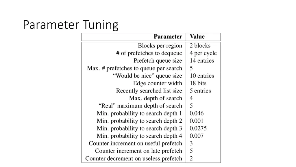 Depth-Limited Depth First Search Search graph using a depth-limited depth-first search 4 hops deep, or up to 5 if there is a node with outdegree 1 Search is also limited by probability: When searching edges from a node, we compute the probability of each edge as its weight divided by the total weight of all edges leading from that node Multiply probabilities along a given path, stopping the search early if we go below a certain tuned threshold for that depth Search initiated at a demand fetch, cache fill, or return instruction As long as the current region hasn t been recently search already Prefetches are scheduled in priority order A few prefetches issued on each cycle, assuming our queue is not empty
