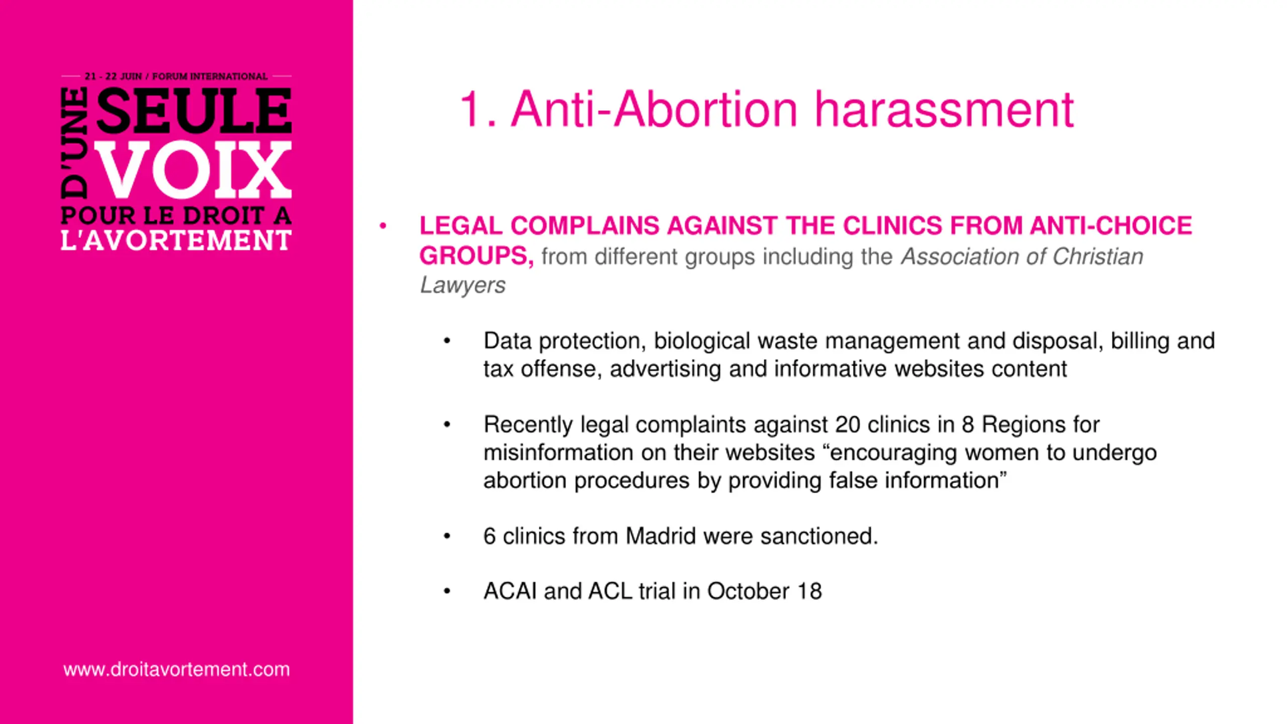 1. Anti-Abortion harassment LEGAL COMPLAINS AGAINST THE CLINICS FROM ANTI-CHOICE GROUPS, from different groups including the Association of Christian Lawyers Data protection, biological waste management and disposal, billing and tax offense, advertising and informative websites content Recently legal complaints against 20 clinics in 8 Regions for misinformation on their websites encouraging women to undergo abortion procedures by providing false information 6 clinics from Madrid were sanctioned. ACAI and ACL trial in October 18 www.droitavortement.com