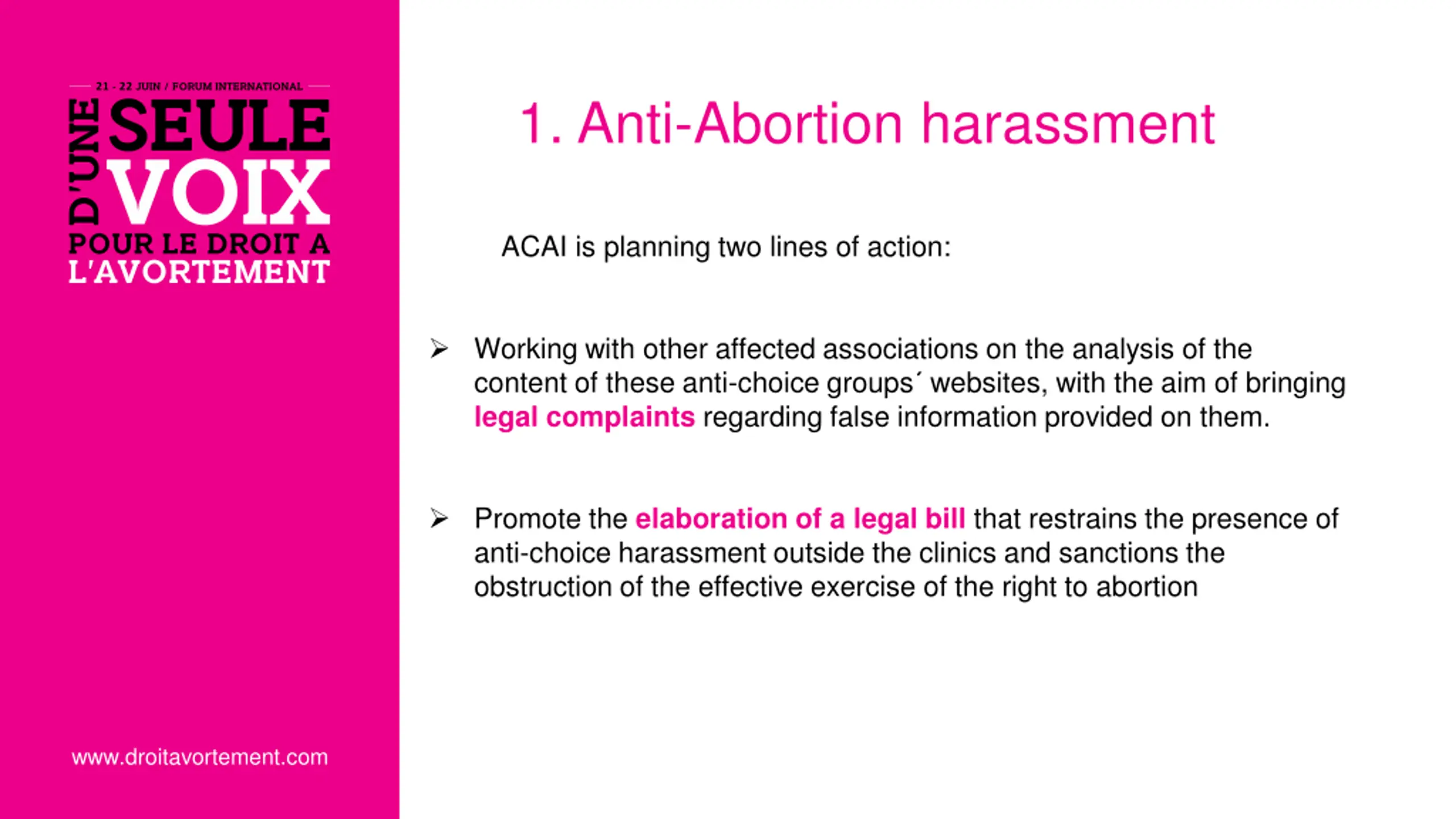 1. Anti-Abortion harassment ACAI is planning two lines of action: Working with other affected associations on the analysis of the content of these anti-choice groups websites, with the aim of bringing legal complaints regarding false information provided on them. Promote the elaboration of a legal bill that restrains the presence of anti-choice harassment outside the clinics and sanctions the obstruction of the effective exercise of the right to abortion www.droitavortement.com