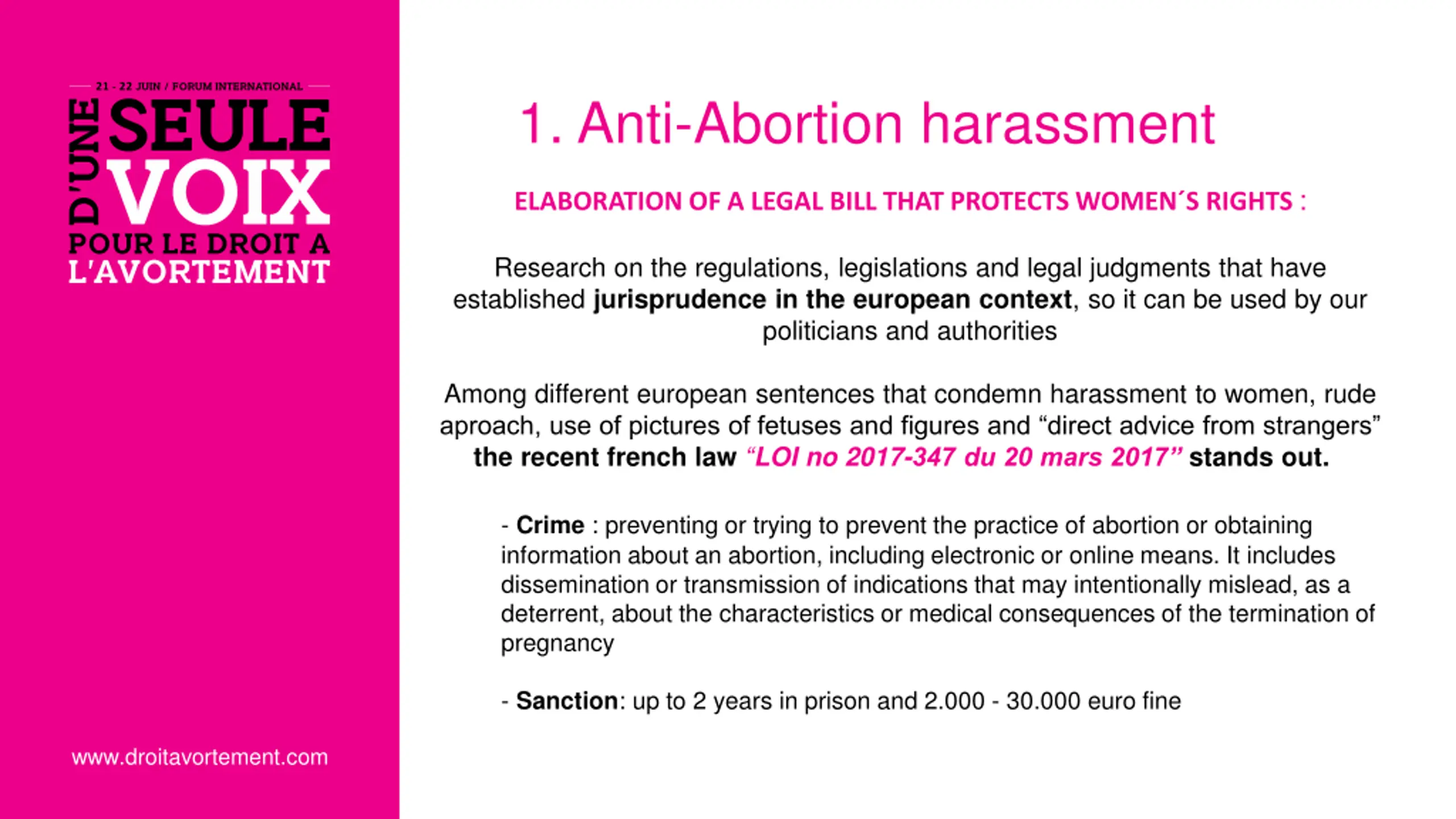 1. Anti-Abortion harassment ELABORATION OF A LEGAL BILL THAT PROTECTS WOMEN S RIGHTS : Research on the regulations, legislations and legal judgments that have established jurisprudence in the european context, so it can be used by our politicians and authorities Among different european sentences that condemn harassment to women, rude aproach, use of pictures of fetuses and figures and direct advice from strangers the recent french law LOI no 2017-347 du 20 mars 2017 stands out. - Crime : preventing or trying to prevent the practice of abortion or obtaining information about an abortion, including electronic or online means. It includes dissemination or transmission of indications that may intentionally mislead, as a deterrent, about the characteristics or medical consequences of the termination of pregnancy - Sanction: up to 2 years in prison and 2.000 - 30.000 euro fine www.droitavortement.com
