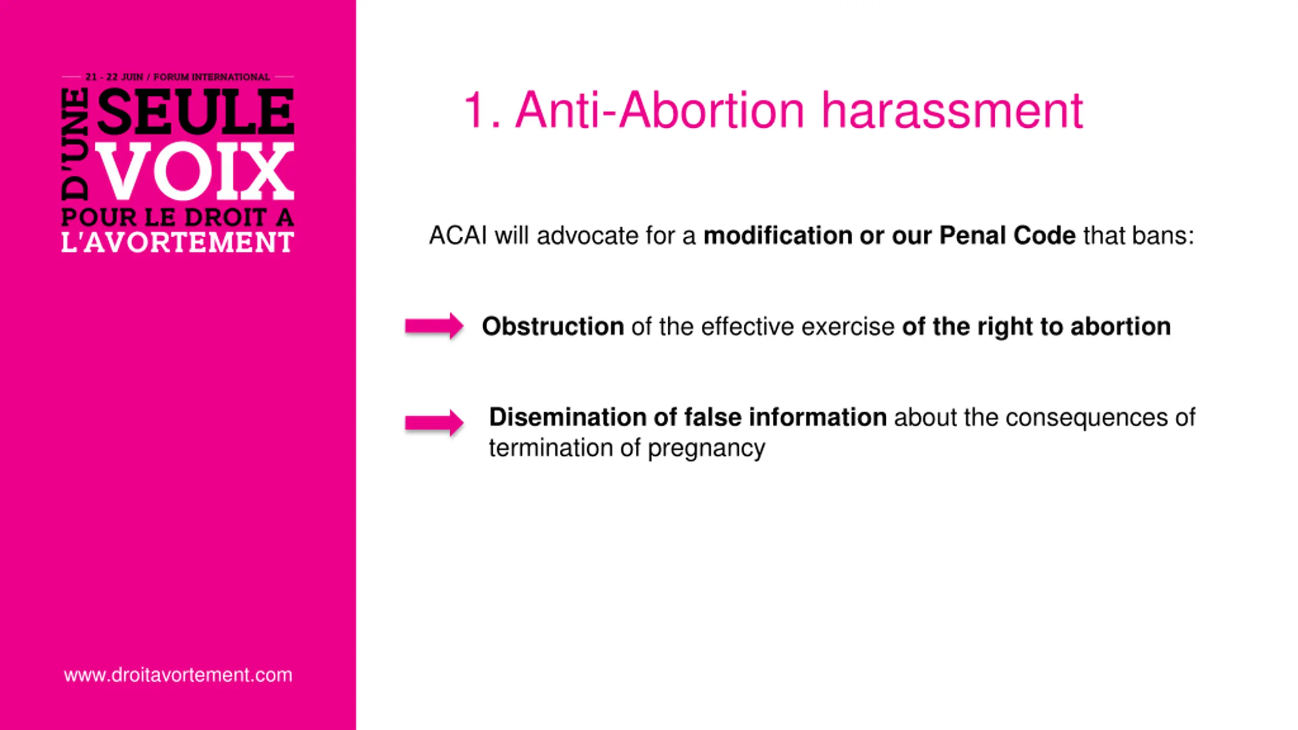 1. Anti-Abortion harassment ACAI will advocate for a modification or our Penal Code that bans: Obstruction of the effective exercise of the right to abortion Disemination of false information about the consequences of termination of pregnancy www.droitavortement.com