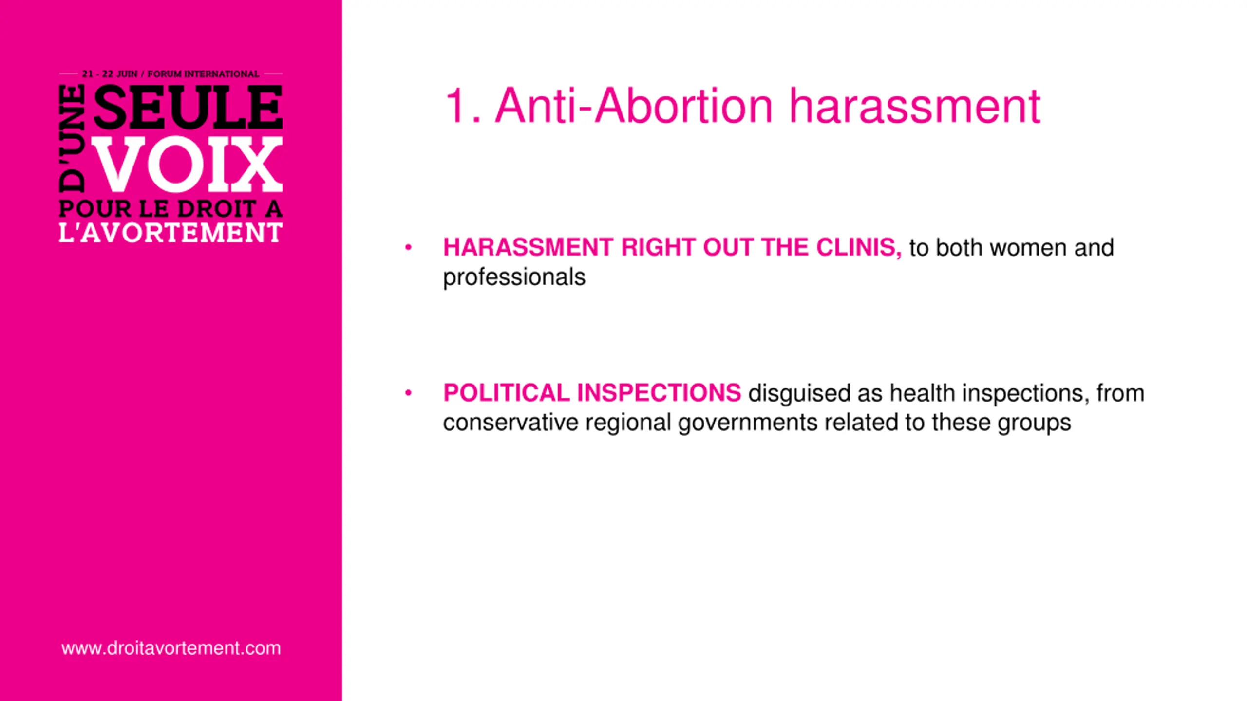 1. Anti-Abortion harassment HARASSMENT RIGHT OUT THE CLINIS, to both women and professionals POLITICAL INSPECTIONS disguised as health inspections, from conservative regional governments related to these groups www.droitavortement.com