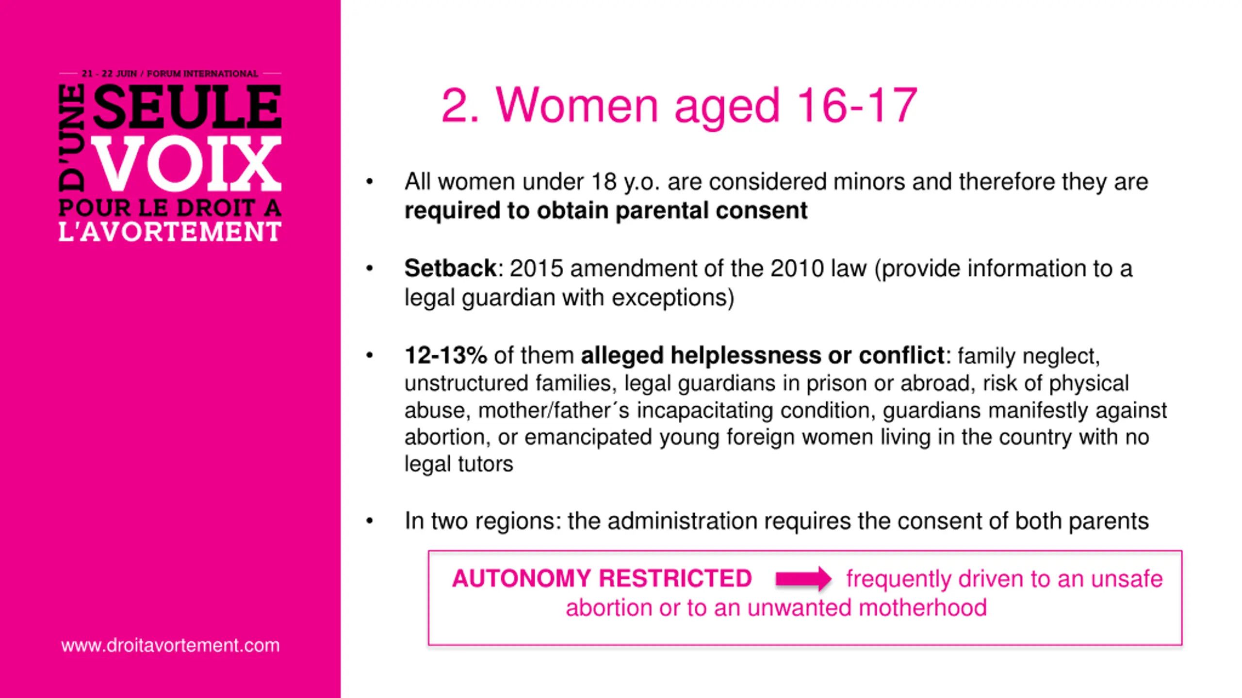 2. Women aged 16-17 All women under 18 y.o. are considered minors and therefore they are required to obtain parental consent Setback: 2015 amendment of the 2010 law (provide information to a legal guardian with exceptions) 12-13% of them alleged helplessness or conflict: family neglect, unstructured families, legal guardians in prison or abroad, risk of physical abuse, mother/father s incapacitating condition, guardians manifestly against abortion, or emancipated young foreign women living in the country with no legal tutors In two regions: the administration requires the consent of both parents AUTONOMY RESTRICTED frequently driven to an unsafe abortion or to an unwanted motherhood www.droitavortement.com