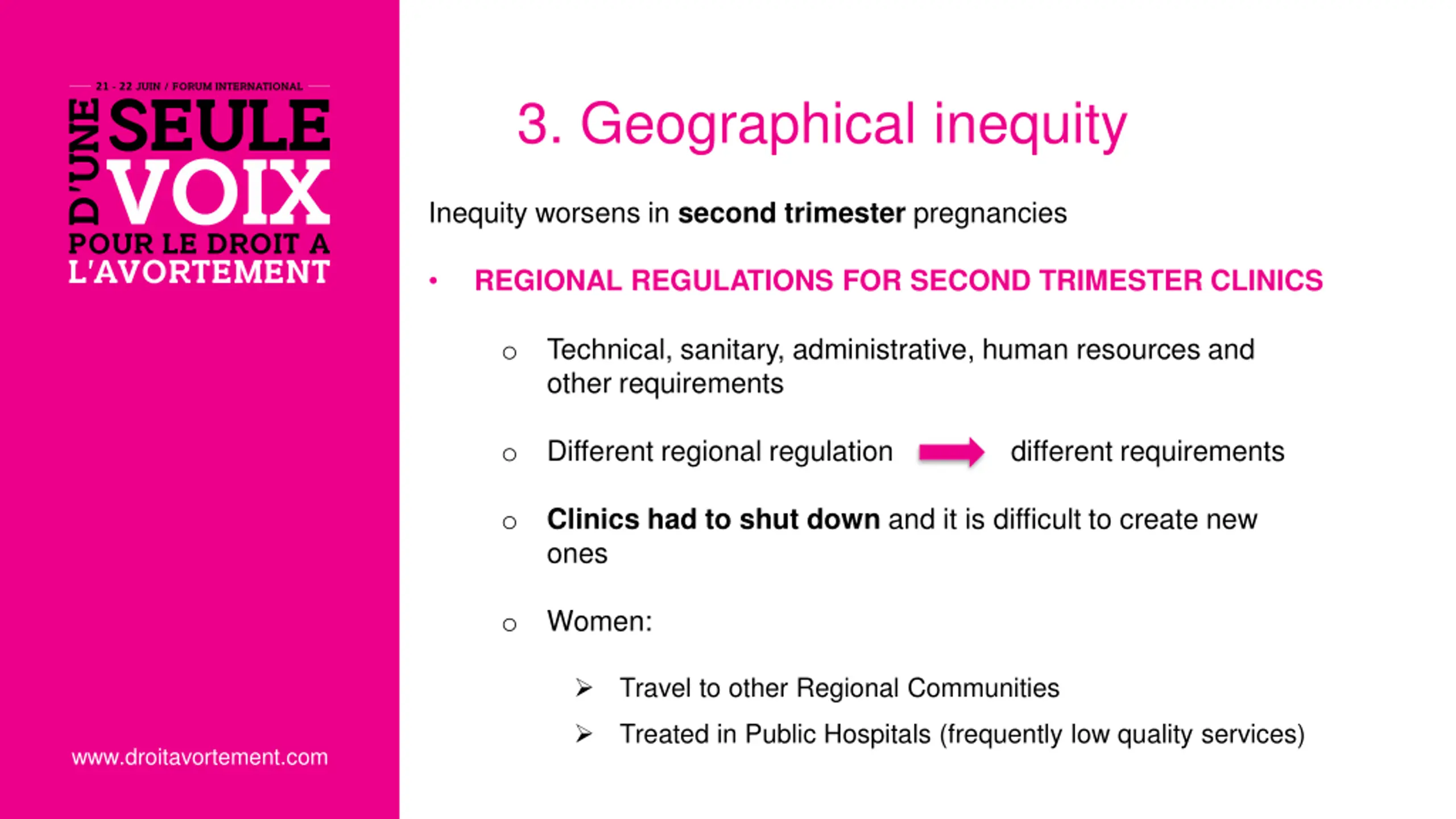3. Geographical inequity Inequity worsens in second trimester pregnancies REGIONAL REGULATIONS FOR SECOND TRIMESTER CLINICS Technical, sanitary, administrative, human resources and other requirements o Different regional regulation different requirements o Clinics had to shut down and it is difficult to create new ones o Women: o Travel to other Regional Communities Treated in Public Hospitals (frequently low quality services) www.droitavortement.com