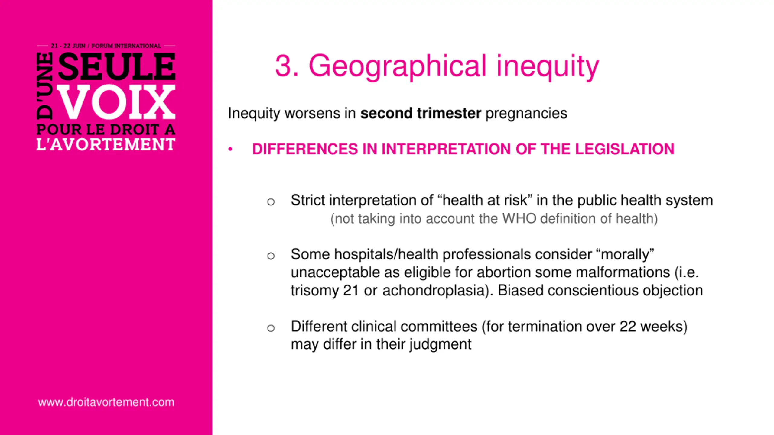 3. Geographical inequity Inequity worsens in second trimester pregnancies DIFFERENCES IN INTERPRETATION OF THE LEGISLATION Strict interpretation of health at risk in the public health system (not taking into account the WHO definition of health) o Some hospitals/health professionals consider morally unacceptable as eligible for abortion some malformations (i.e. trisomy 21 or achondroplasia). Biased conscientious objection o Different clinical committees (for termination over 22 weeks) may differ in their judgment o www.droitavortement.com
