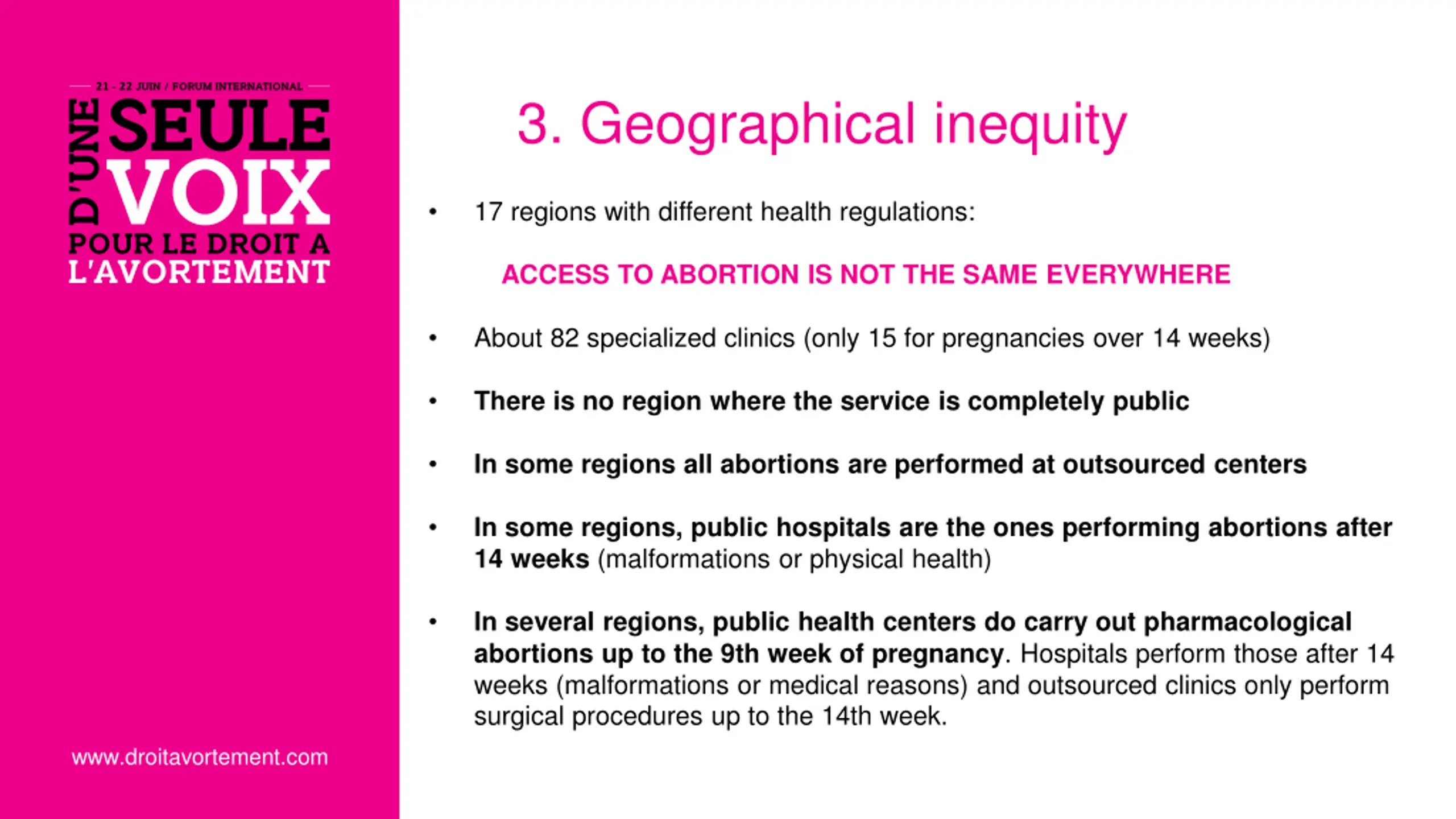 3. Geographical inequity 17 regions with different health regulations: ACCESS TO ABORTION IS NOT THE SAME EVERYWHERE About 82 specialized clinics (only 15 for pregnancies over 14 weeks) There is no region where the service is completely public In some regions all abortions are performed at outsourced centers In some regions, public hospitals are the ones performing abortions after 14 weeks (malformations or physical health) In several regions, public health centers do carry out pharmacological abortions up to the 9th week of pregnancy. Hospitals perform those after 14 weeks (malformations or medical reasons) and outsourced clinics only perform surgical procedures up to the 14th week. www.droitavortement.com