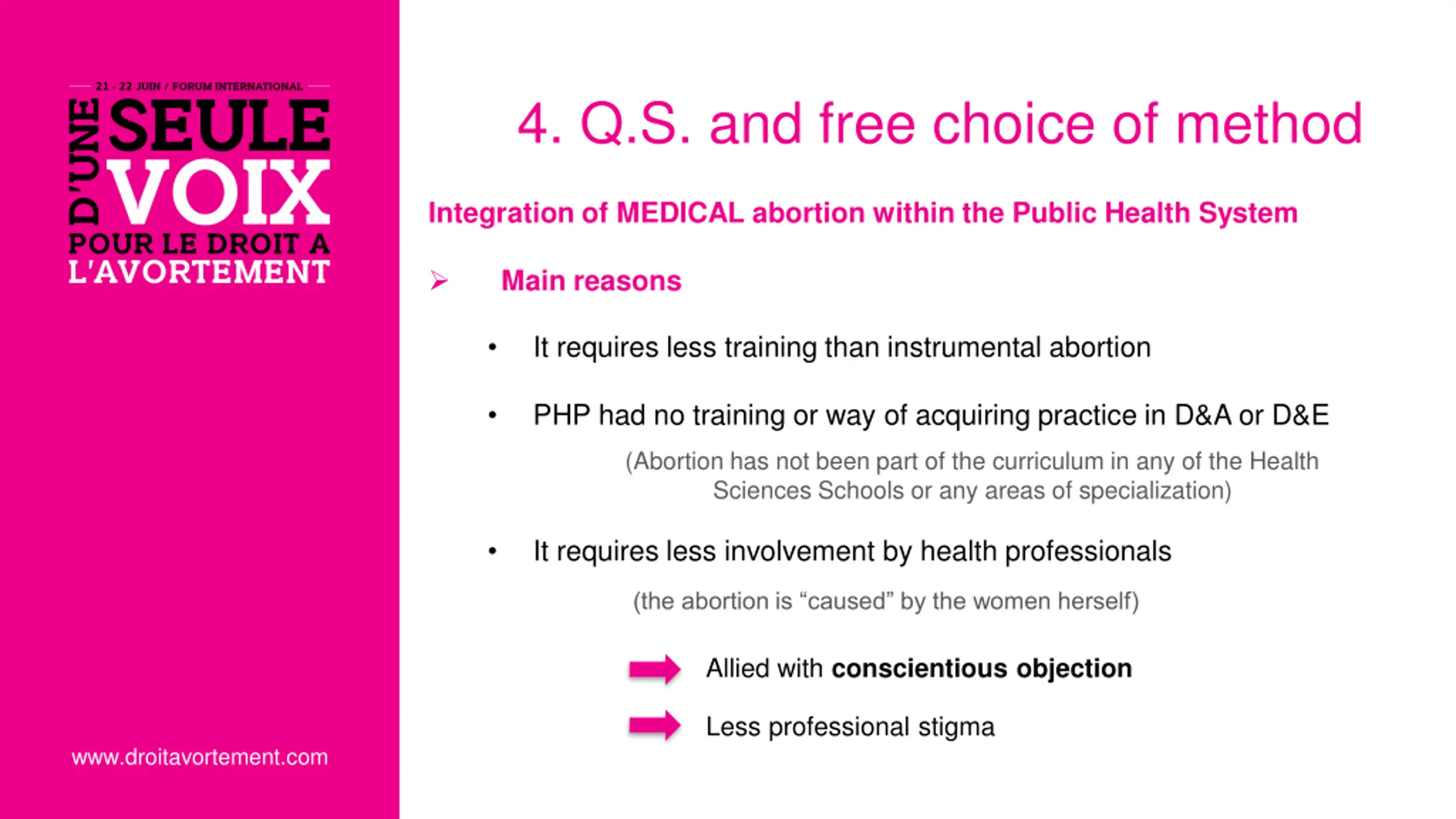 4. Q.S. and free choice of method Integration of MEDICAL abortion within the Public Health System Main reasons It requires less training than instrumental abortion PHP had no training or way of acquiring practice in D&A or D&E (Abortion has not been part of the curriculum in any of the Health Sciences Schools or any areas of specialization) It requires less involvement by health professionals (the abortion is caused by the women herself) Allied with conscientious objection Less professional stigma www.droitavortement.com