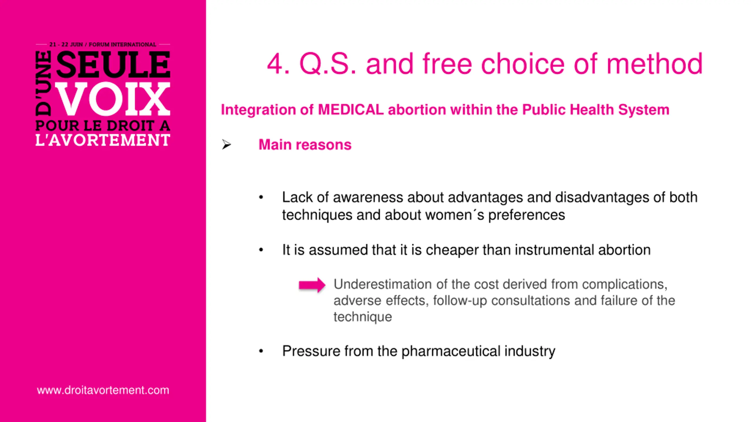 4. Q.S. and free choice of method Integration of MEDICAL abortion within the Public Health System Main reasons Lack of awareness about advantages and disadvantages of both techniques and about women s preferences It is assumed that it is cheaper than instrumental abortion Underestimation of the cost derived from complications, adverse effects, follow-up consultations and failure of the technique Pressure from the pharmaceutical industry www.droitavortement.com