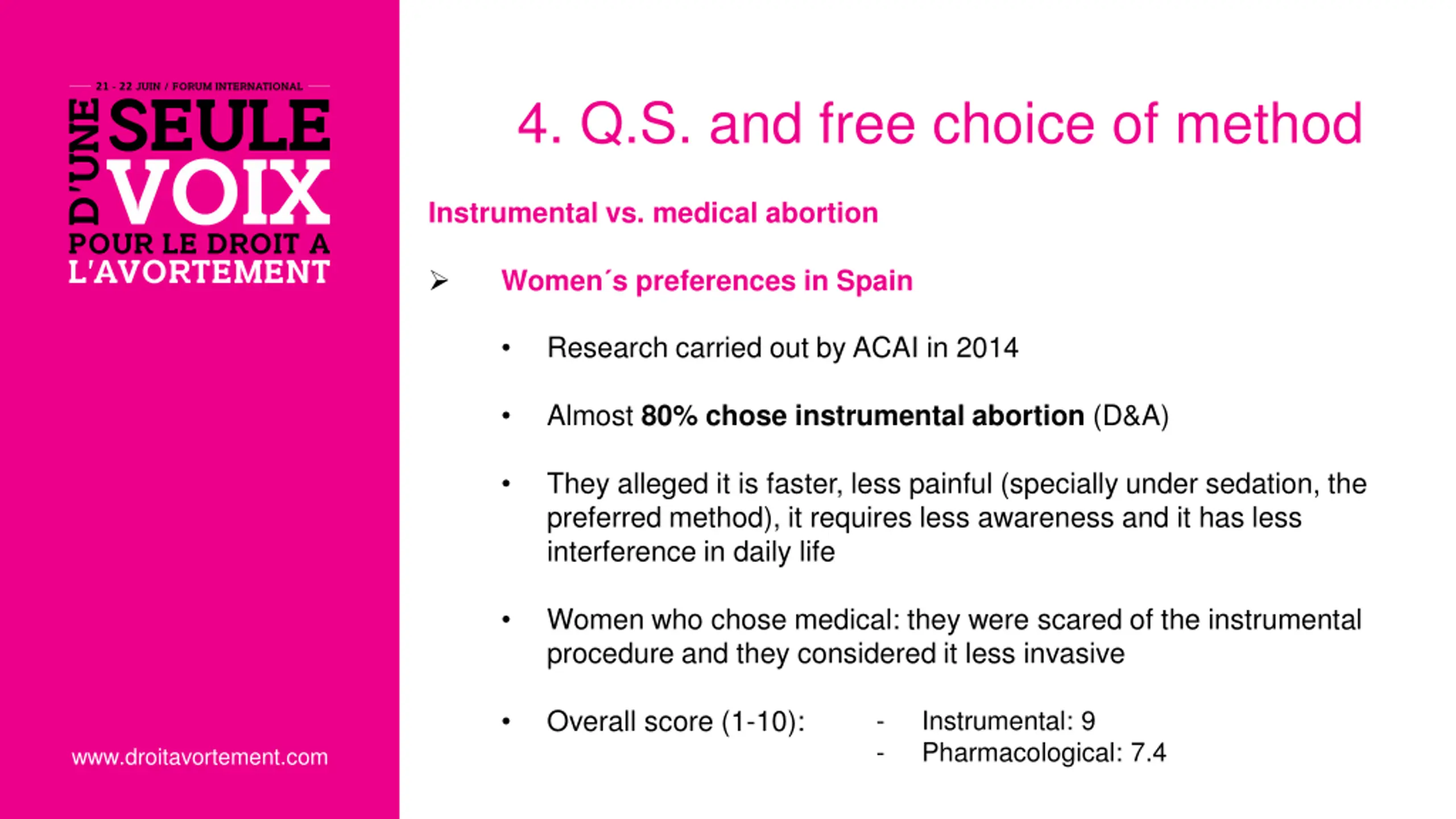 4. Q.S. and free choice of method Instrumental vs. medical abortion Women s preferences in Spain Research carried out by ACAI in 2014 Almost 80% chose instrumental abortion (D&A) They alleged it is faster, less painful (specially under sedation, the preferred method), it requires less awareness and it has less interference in daily life Women who chose medical: they were scared of the instrumental procedure and they considered it less invasive Overall score (1-10): - - Instrumental: 9 Pharmacological: 7.4 www.droitavortement.com