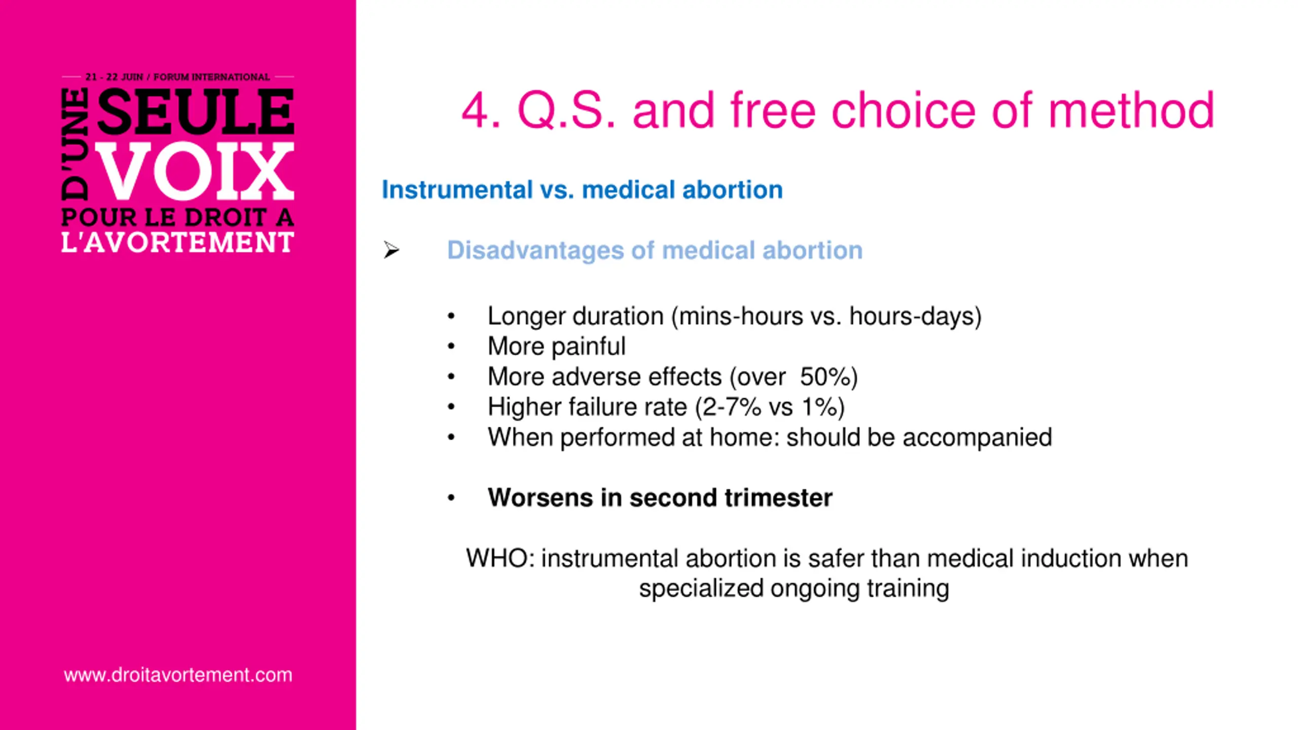 4. Q.S. and free choice of method Instrumental vs. medical abortion Disadvantages of medical abortion Longer duration (mins-hours vs. hours-days) More painful More adverse effects (over 50%) Higher failure rate (2-7% vs 1%) When performed at home: should be accompanied Worsens in second trimester WHO: instrumental abortion is safer than medical induction when specialized ongoing training www.droitavortement.com