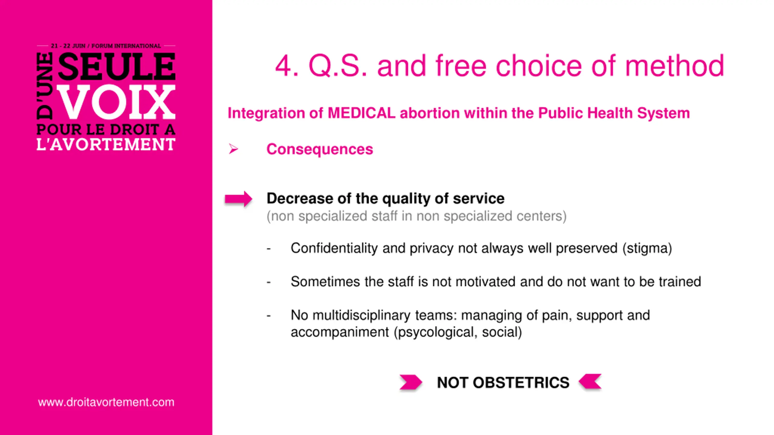 4. Q.S. and free choice of method Integration of MEDICAL abortion within the Public Health System Consequences Decrease of the quality of service (non specialized staff in non specialized centers) - Confidentiality and privacy not always well preserved (stigma) - Sometimes the staff is not motivated and do not want to be trained - No multidisciplinary teams: managing of pain, support and accompaniment (psycological, social) NOT OBSTETRICS www.droitavortement.com