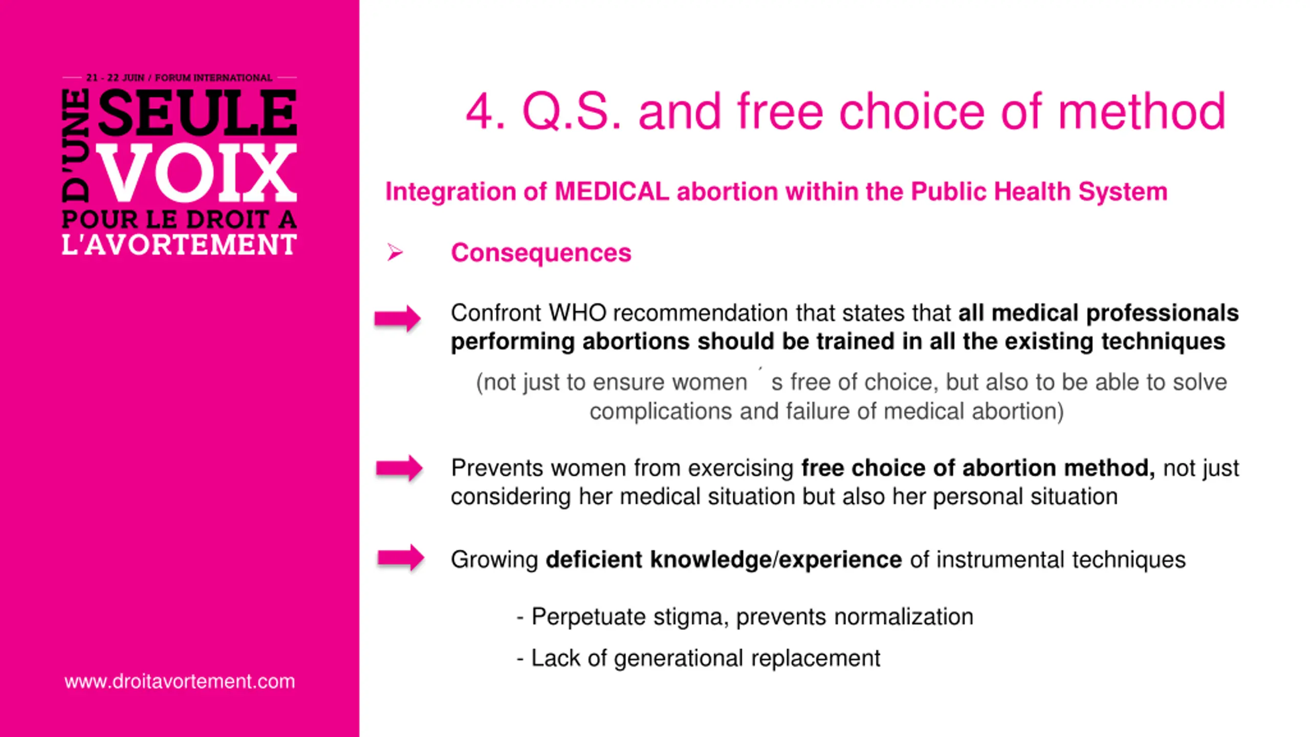 4. Q.S. and free choice of method Integration of MEDICAL abortion within the Public Health System Consequences Confront WHO recommendation that states that all medical professionals performing abortions should be trained in all the existing techniques (not just to ensure women s free of choice, but also to be able to solve complications and failure of medical abortion) Prevents women from exercising free choice of abortion method, not just considering her medical situation but also her personal situation Growing deficient knowledge/experience of instrumental techniques - Perpetuate stigma, prevents normalization - Lack of generational replacement www.droitavortement.com