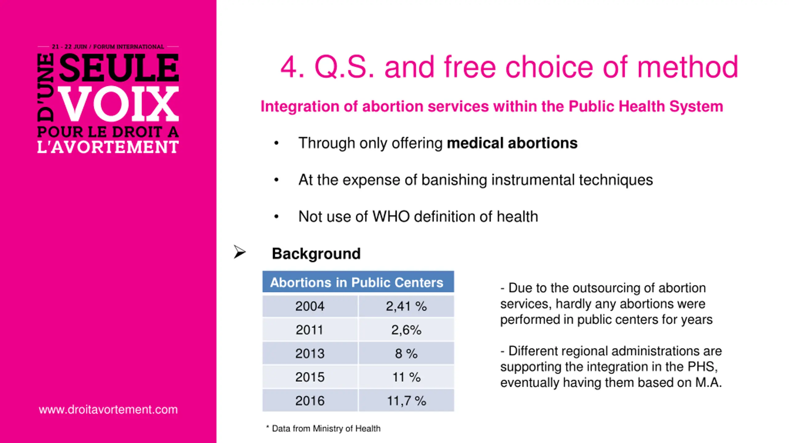 4. Q.S. and free choice of method Integration of abortion services within the Public Health System Through only offering medical abortions At the expense of banishing instrumental techniques Not use of WHO definition of health Background Abortions in Public Centers - Due to the outsourcing of abortion services, hardly any abortions were performed in public centers for years 2004 2,41 % 2011 2,6% - Different regional administrations are supporting the integration in the PHS, eventually having them based on M.A. 2013 8 % 2015 11 % 2016 11,7 % www.droitavortement.com * Data from Ministry of Health