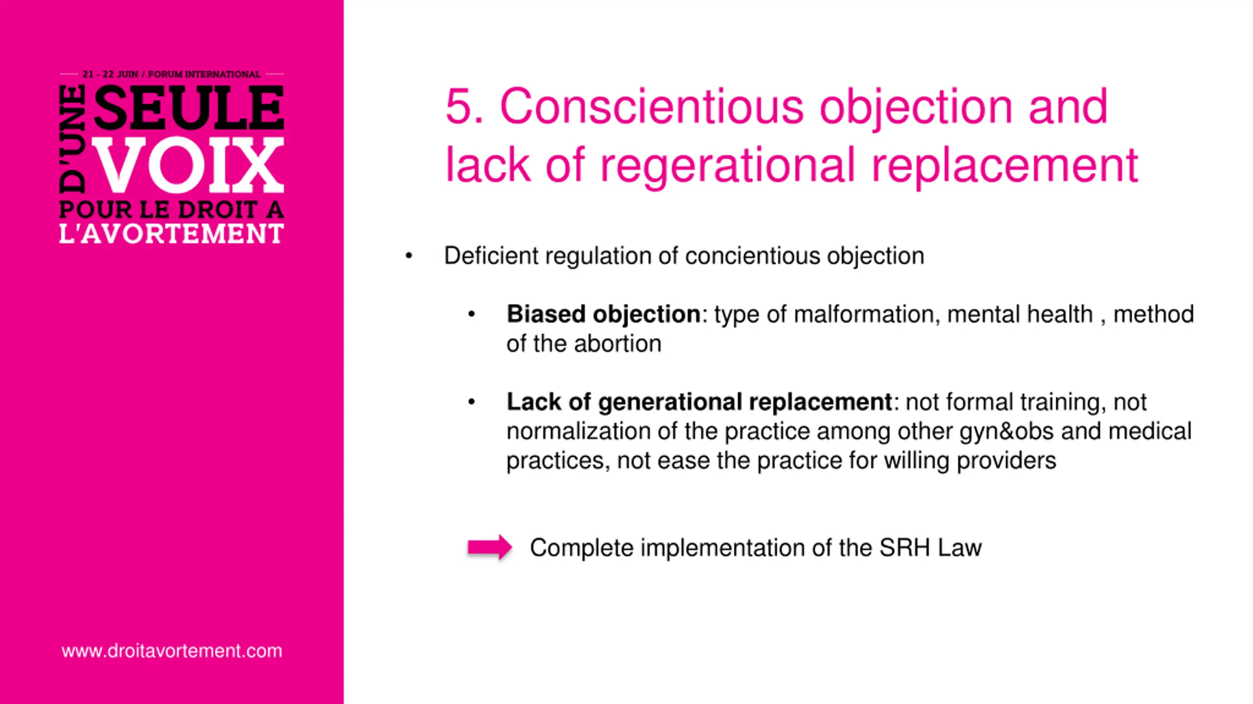 5. Conscientious objection and lack of regerational replacement Deficient regulation of concientious objection Biased objection: type of malformation, mental health , method of the abortion Lack of generational replacement: not formal training, not normalization of the practice among other gyn&obs and medical practices, not ease the practice for willing providers Complete implementation of the SRH Law www.droitavortement.com