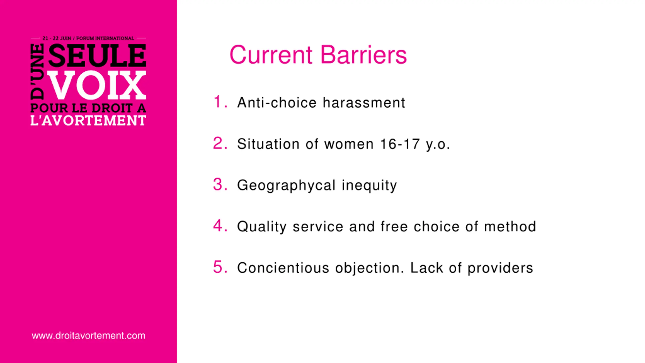 Current Barriers 1. Anti-choice harassment 2. Situation of women 16-17 y.o. 3. Geographycal inequity 4. Quality service and free choice of method 5. Concientious objection. Lack of providers www.droitavortement.com